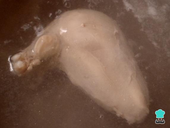 Limpe o peito de frango de peles e gorduras e cozinhe uma panela com água e sal por 20 minutos ou até ficar pronto.