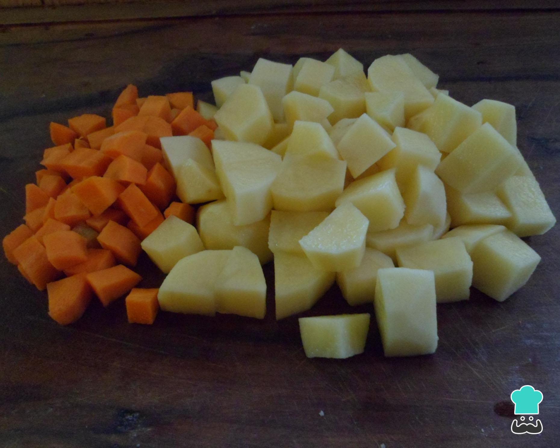 Enquanto isso prepare as batatas e a cenoura: descasque e corte em cubinhos com mais ou menos o mesmo tamanho. Cozinhe em panelas separadas, porque estes legumes têm diferentes tempos de cozimento: as batatas deverão ferver por 5 minutos e a cenoura estará pronta após 2-3 minutos fervendo.