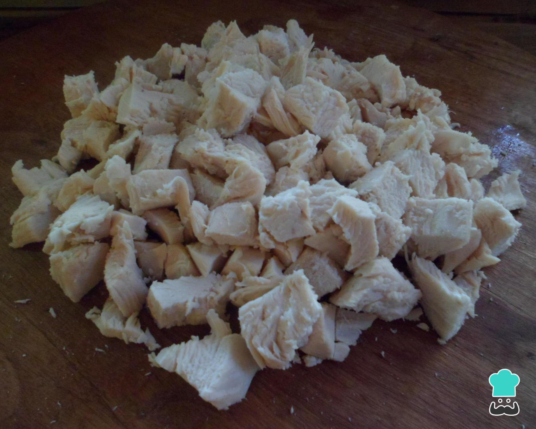 Quando o peito de frango estiver pronto escorra a água e deixe esfriar um pouco. Depois desfie ou pique em pedacinhos com mais ou menos o mesmo tamanho que a cenoura e as batatas.