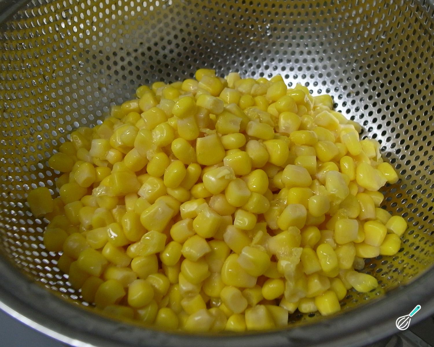Prepare os ingredientes: escorra o milho e enxague debaixo de água filtrada, com a ajuda de um coador ou peneira. Pique metade do abacaxi de uma lata de abacaxi e coloque num bowl junto com o milho.