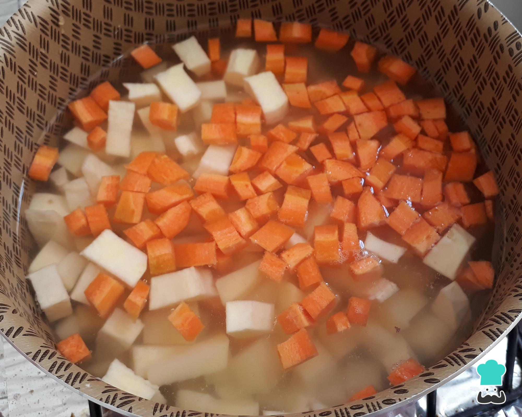 Primeiramente, corte as batatas e a cenoura para cozinhá-los numa panela com água e sal. Quando estiverem macios, escorra e deixe esfriar.