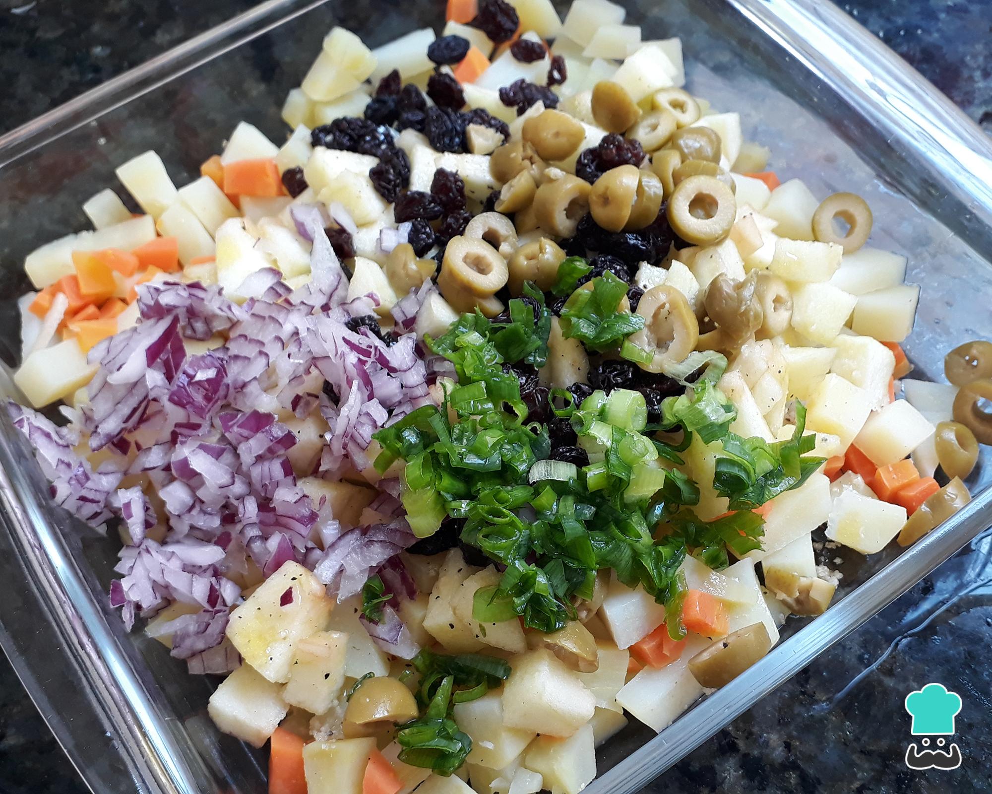 Na sequência, pique em cubinhos bem pequenos a maçã verde, a cebola roxa e as azeitonas. Junte o restante dos ingredientes (as uvas passas, o cheiro verde, sal, pimenta e um fio de azeite) e misture bem. Por último coloque a maionese e volte a misturar.