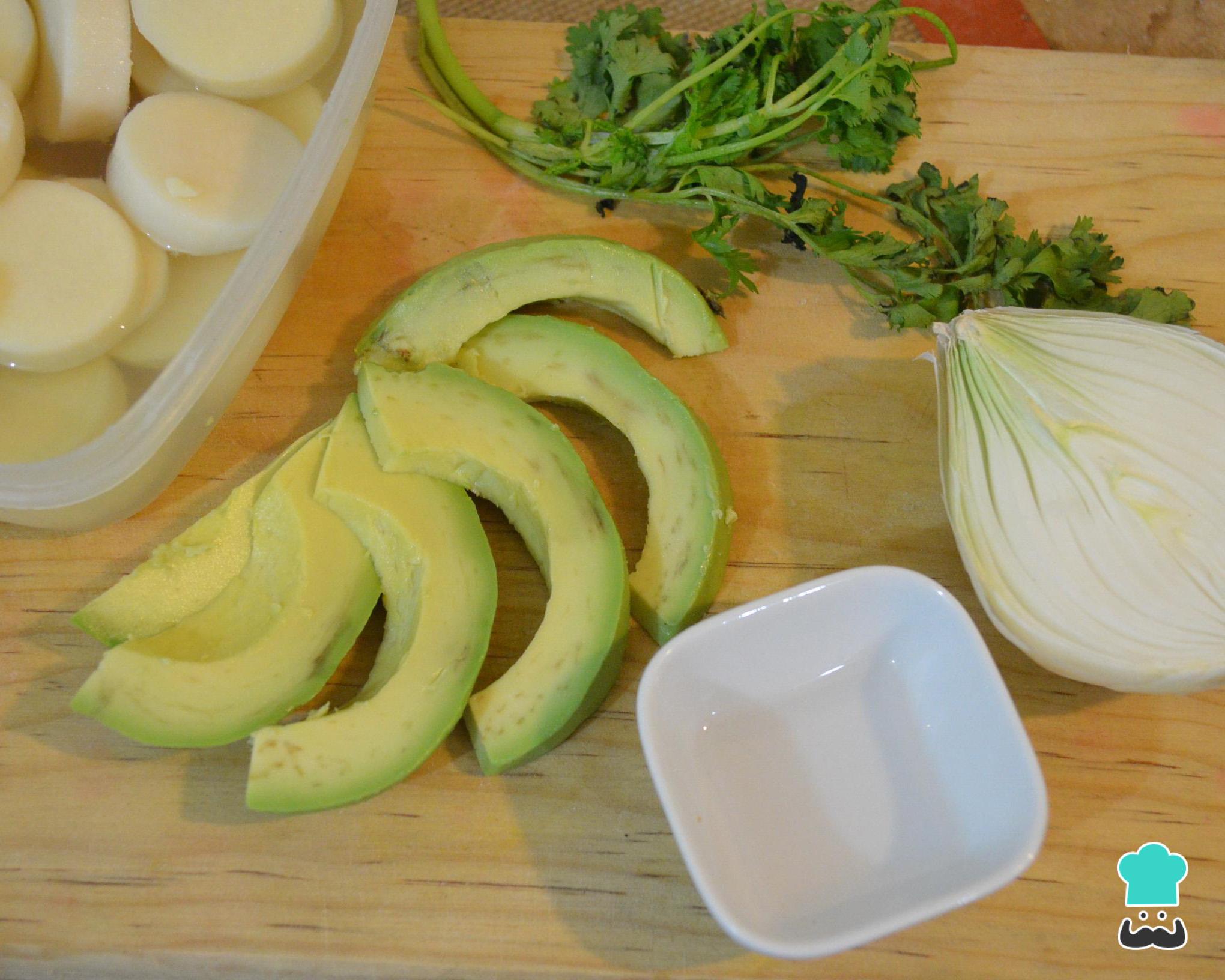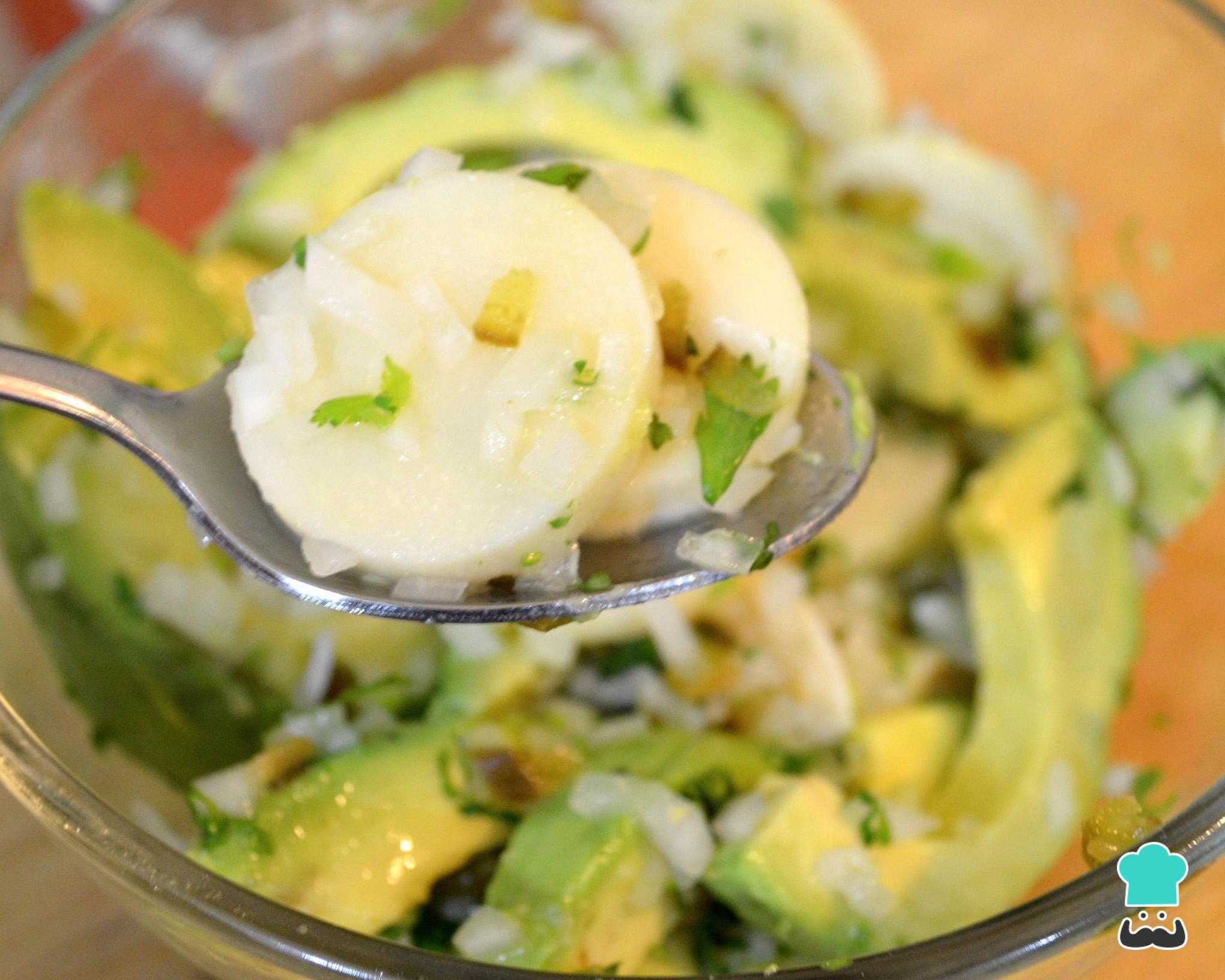 Esta receita de salada de palmito com abacate tem gostinho avinagrado e a sua aparência lembra um ceviche, porém é preparada somente com ingredientes de origem vegetal, sendo uma salada indicada também para vegetarianos e veganos. O tempero é bem simples: suco de limão, azeite, salsinha, suco de laranja e vinagre é tudo o que você precisa para conferir mais sabor nessa salada de abacate, palmito e cebola.