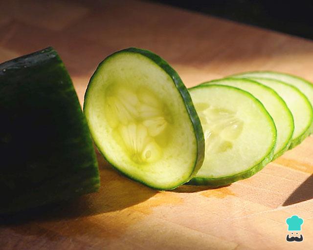 Lave bem os pepinos, se necessário higienizando-os, pois nesta receita serão usados com casca. Depois corte em fatias bem fininhas, quase transparentes, usando uma faca afiada ou fatiador de legumes.