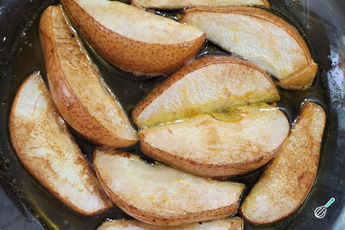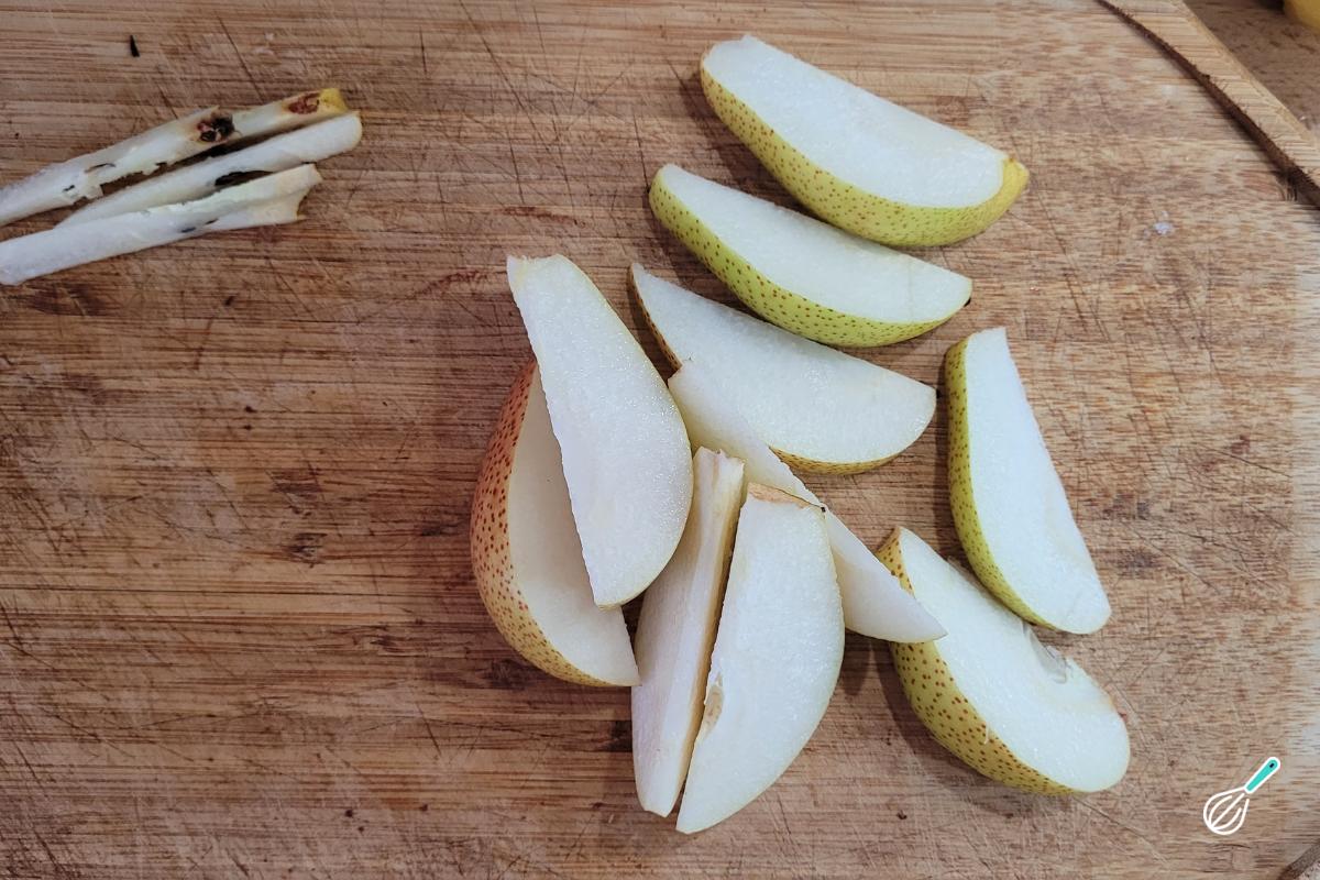Corte as peras em gomos, retirando as sementes, mas não precisa descascar.