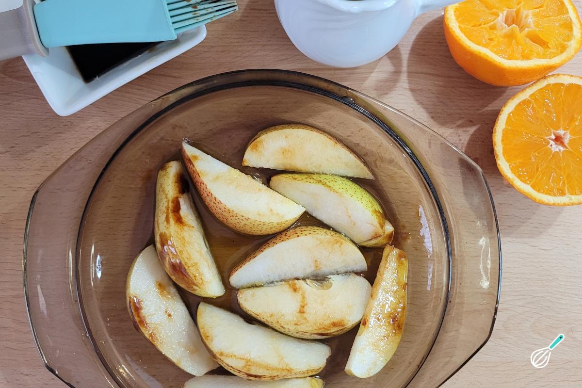 Disponha as peras na assadeira sem sobrepor. Pincele um pouco de mel ou melado e regue com suco de laranja.