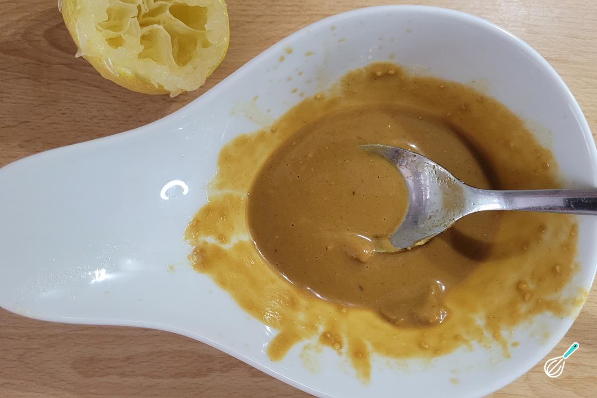 Prepara o molho misturando a mostarda, o melado, o suco de limão e sal a gosto. Você pode ajustar a consistência adicionando água, mais suco de limão ou até um pouquinho de azeite.