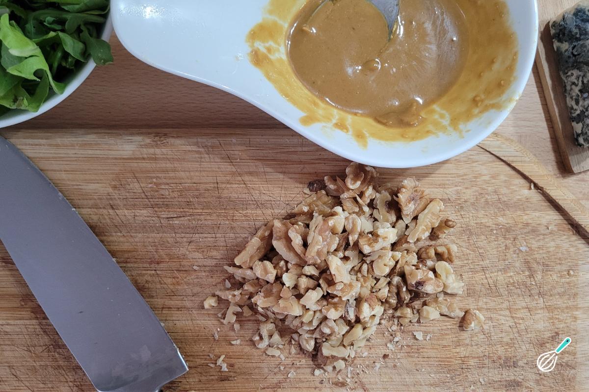 Pique as nozes em pedaços menores para que fiquem mais delicadas na salada.