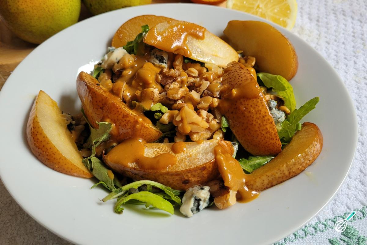 A combinação de pera e gorgonzola é um clássico e funciona muito bem também em saladas. Aqui as peras vão assadas no forno com um toque de mel, azeite e suco de laranja. Esta salada de pera com gorgonzola é finalizada com um molho agridoce para acentuar ainda mais o sabor, além de trazer a crocância das nozes e o leve amargor da rúcula que contrasta muito bem, mas também funciona com qualquer mix de folhas que preferir.