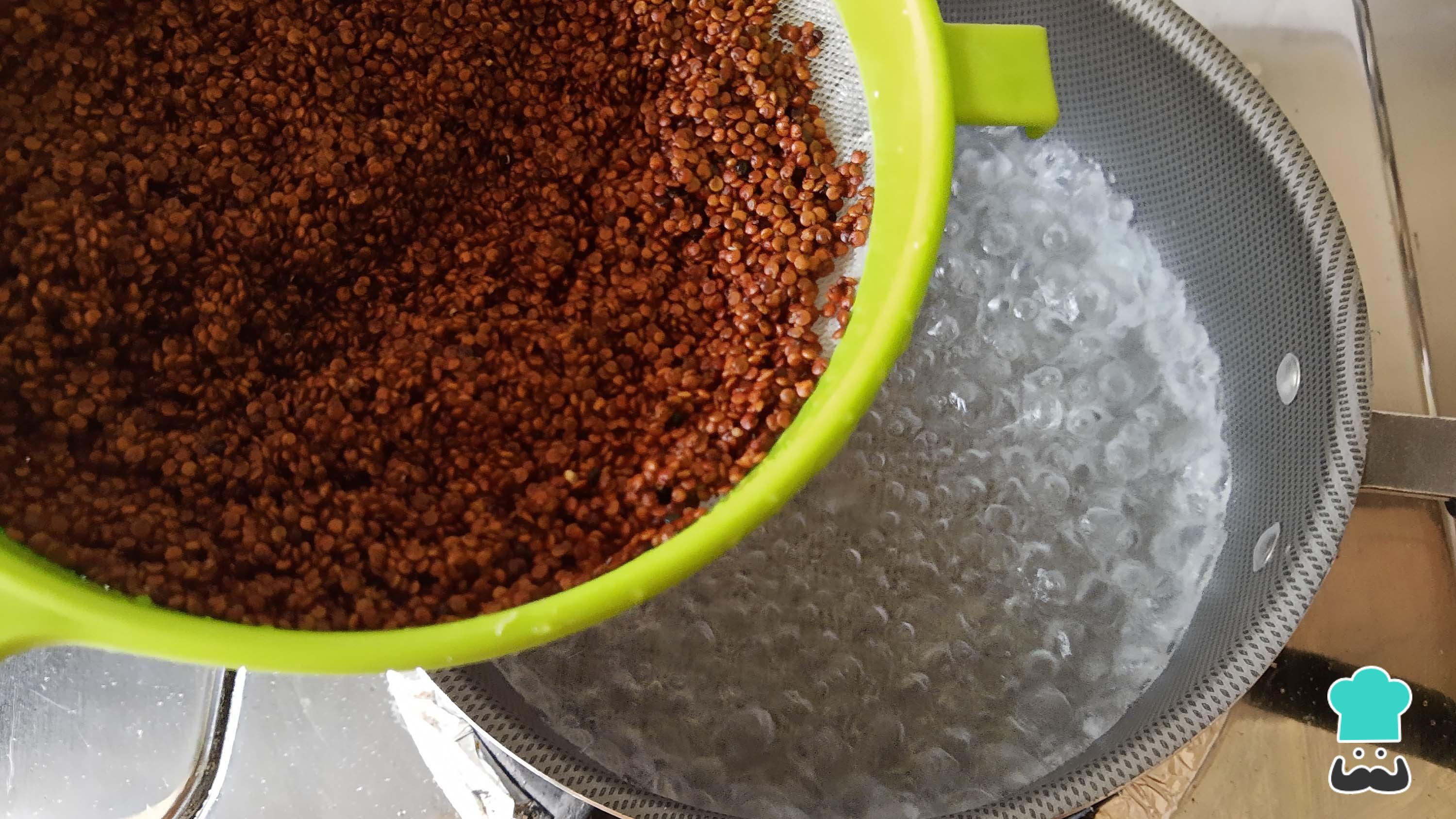 Para cozinhar quinoa vermelha, primeiro enxague a quinoa sob água corrente, esfregando suavemente as sementes. Escorra e cozinhe numa panela com água fervente por 15 minutos ou até que a quinoa tenha absorvido toda a água. Quando pronto, deixar esfriar e descansar.