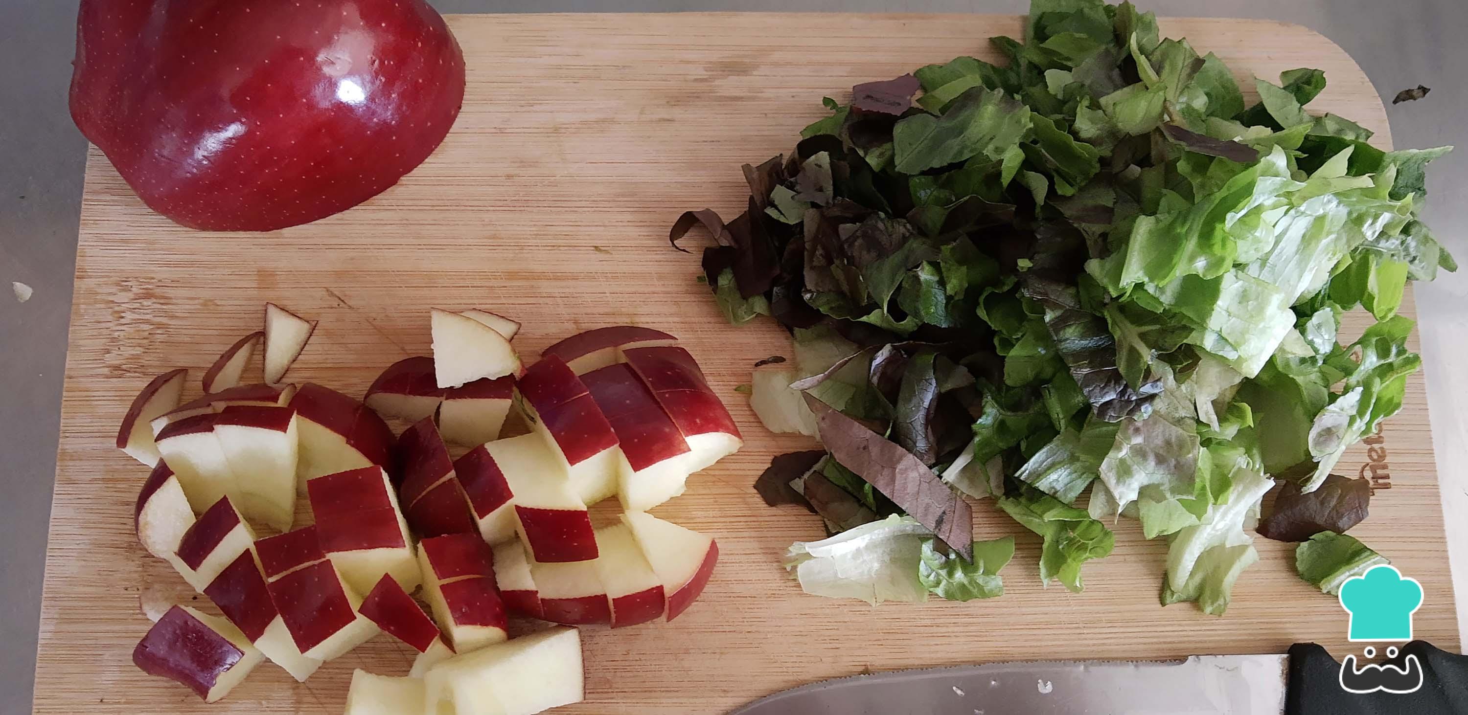 Para acompanhar a quinoa, higienize a alface e corte em pedaços, como na foto. Higienize as maçãs e corte-as em cubos ou fatias. Você pode usar outro tipo de maçã, no entanto as maçãs vermelhas são mais doces.