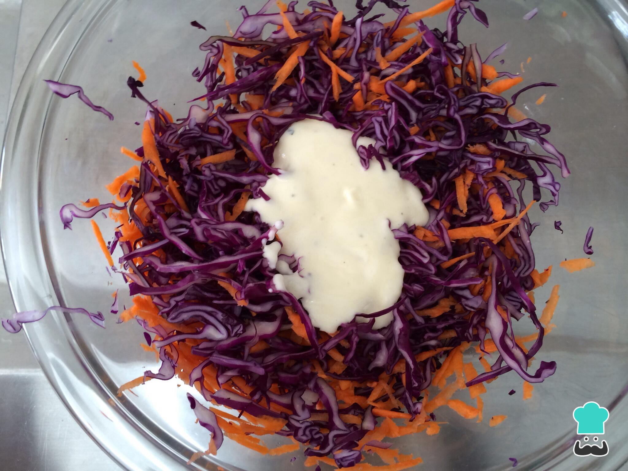 Coloque a cenoura e o repolho em uma tigela, acrescente o molho anterior e misture tudo. Corrija o sabor com sal e pimenta.