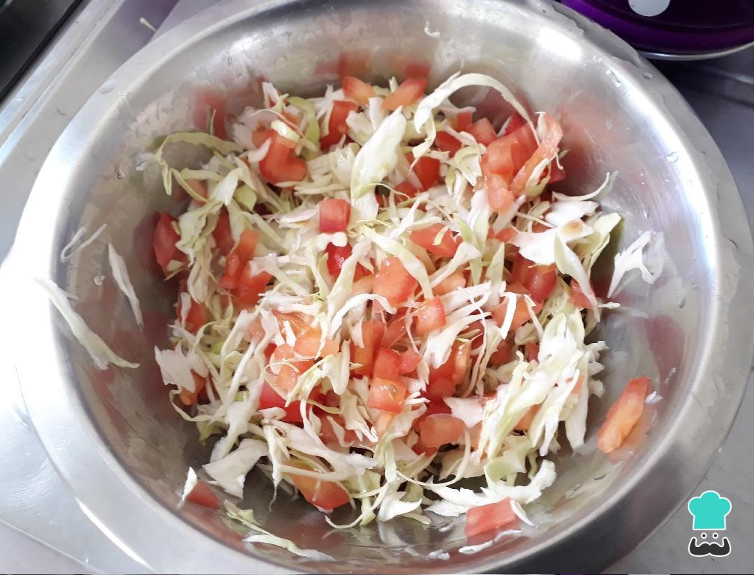 Pique o tomate em cubos pequenos e fatie o repolho bem fininho - se quiser, pode utilizar um fatiador para auxiliar. Coloque num bowl os dois ingredientes desta salada de repolho e gengibre.