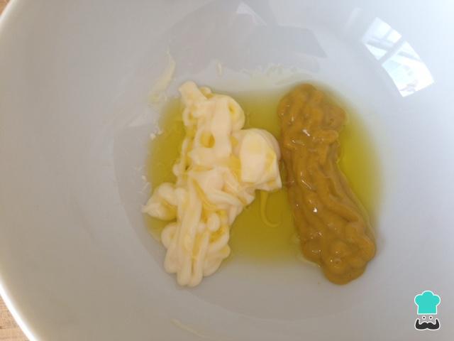 Prepare o molho misturando o azeite com a maionese e a mostarda.