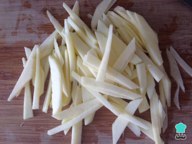Descasque a maçã e corte em palitos finos. Neste caso, utilizámos a maçã golden.