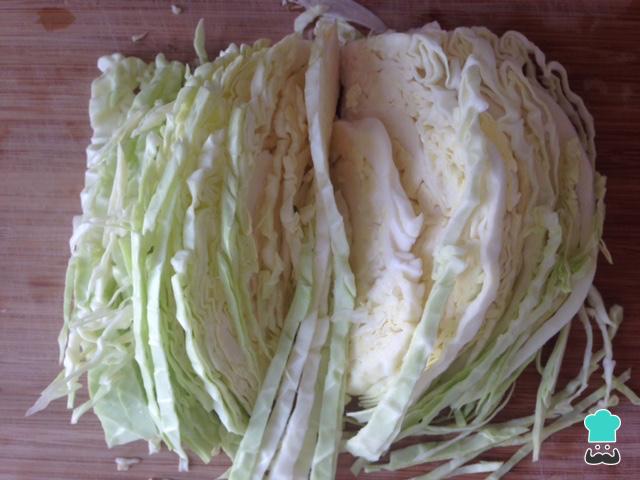 Corte o repolho em fatias finas, lave e seque bem para que a salada não fique com água.
