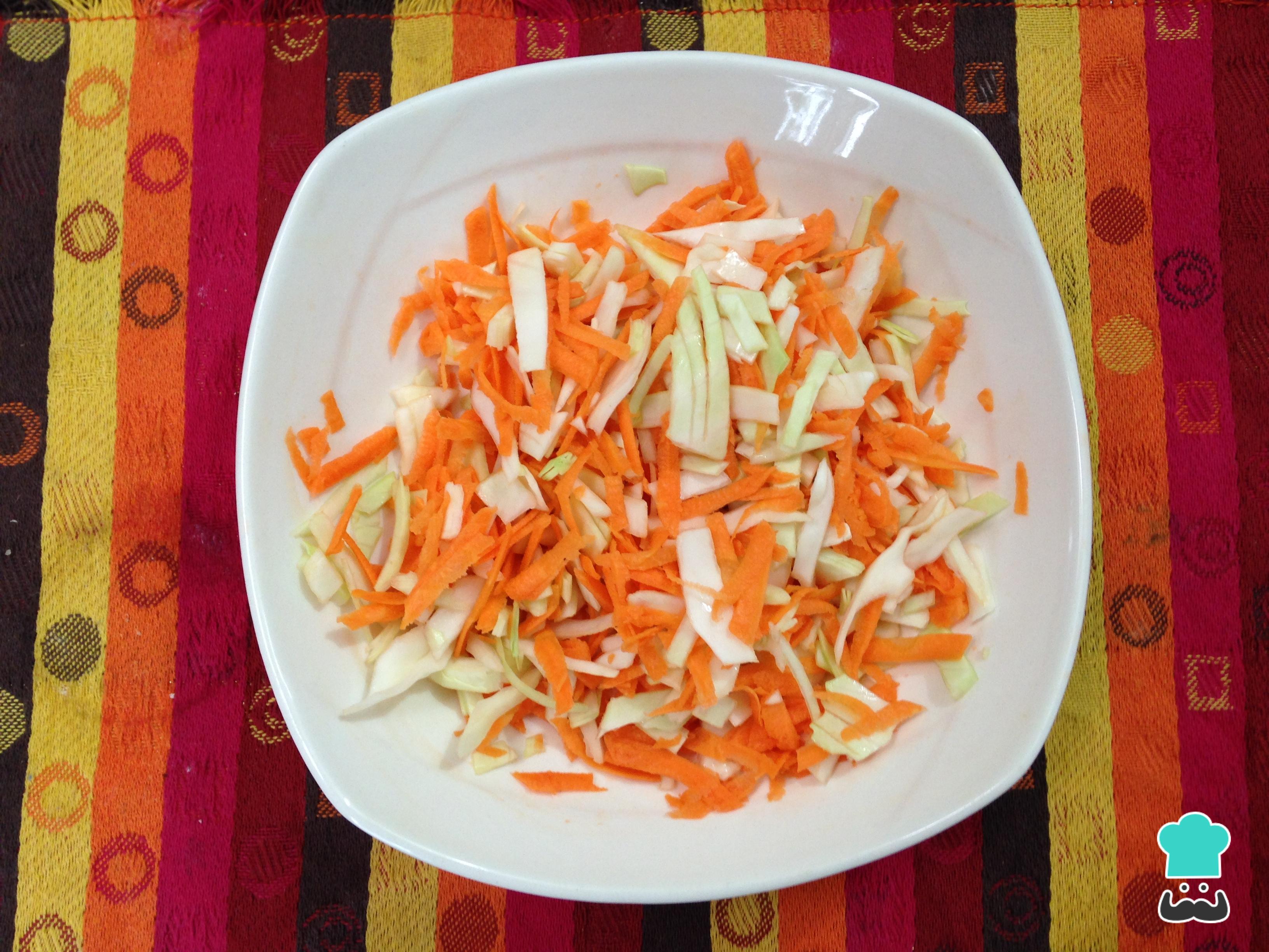 Descasque e rale a cenoura, adicione-a ao repolho.