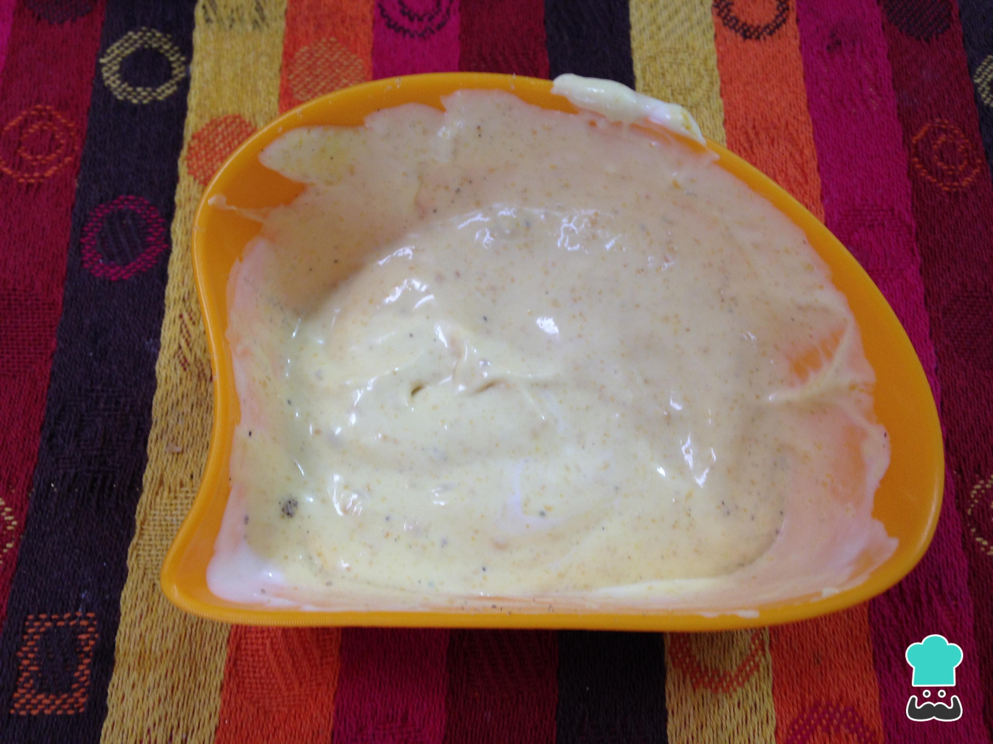 Prepare o molho da salada de repolho e cenoura misturando a mostarda com o creme de leite.
