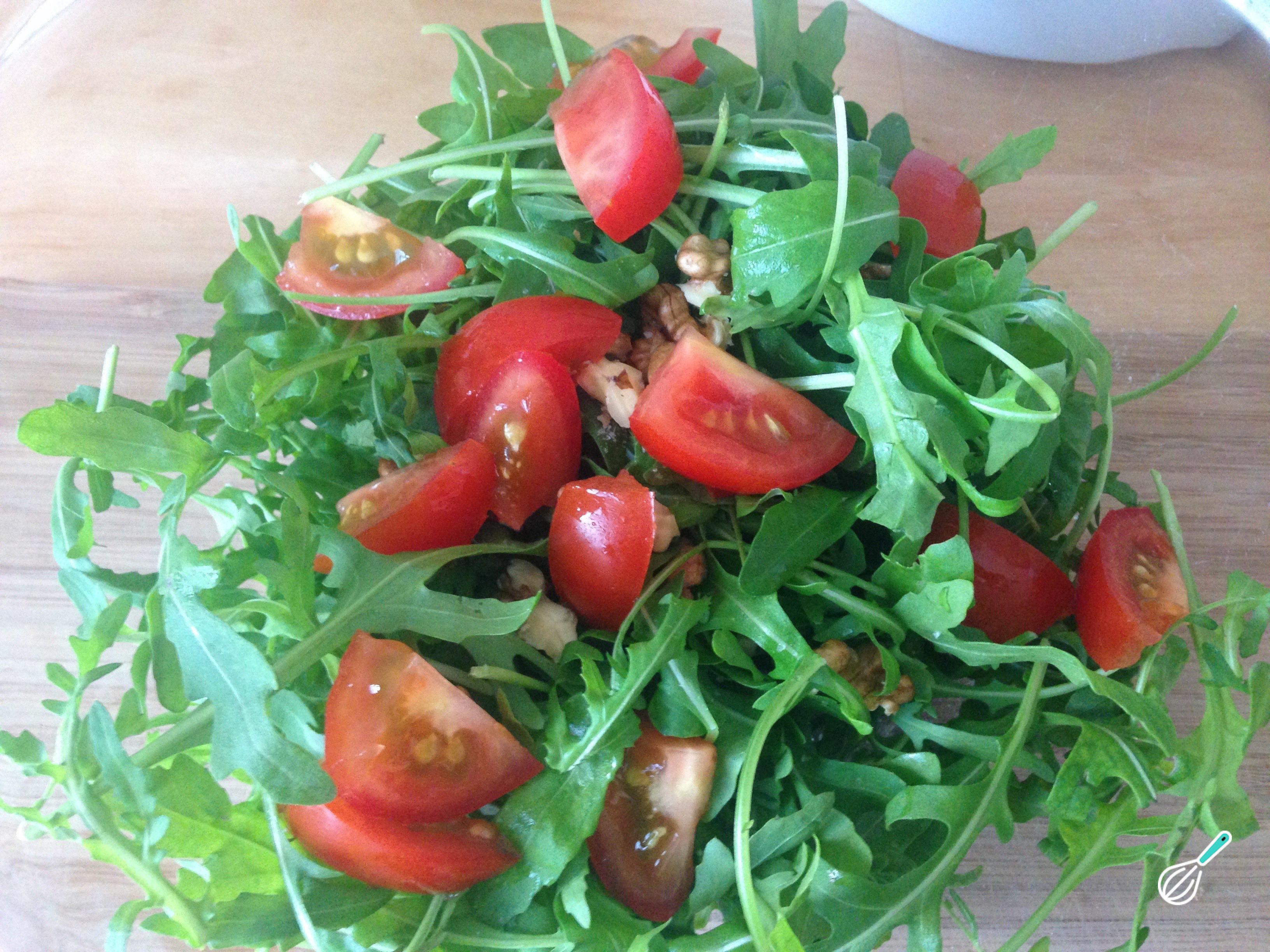 Em seguida lave os tomates, corte em pedaços e adicione à rúcula.
