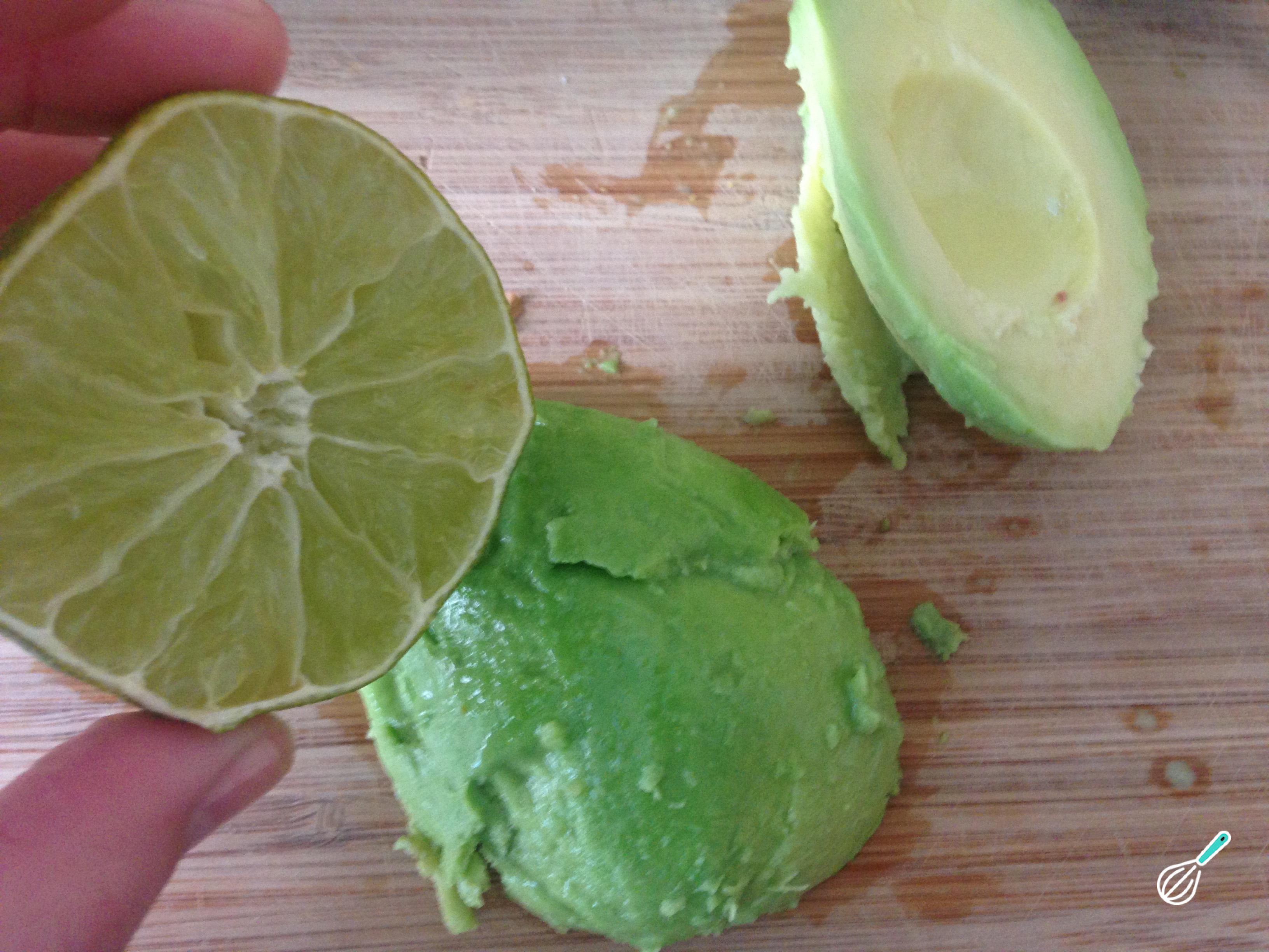 Prepare o abacate descascando-o e retirando-lhe o caroço. Para evitar que o abacate escureça, pingue algumas gotas de limão.