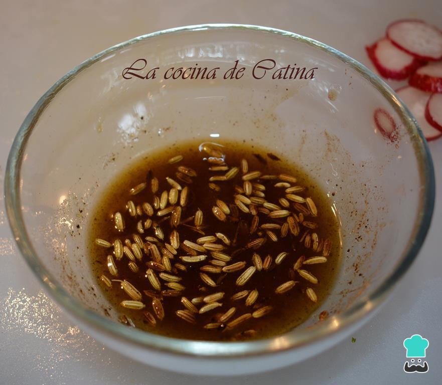 O primeiro passo para fazer esta salada de tâmaras e laranja é começar a preparar o molho de alho. Toste as sementes de erva doce em uma frigideira e de seguida desfaça-as ligeiramente. Em uma taça coloque a canela, o alho esmagado, a água, o suco de limão e as sementes de erva doce. De seguida, junte o sal, a pimenta do reino, o azeite e misture tudo muito bem.