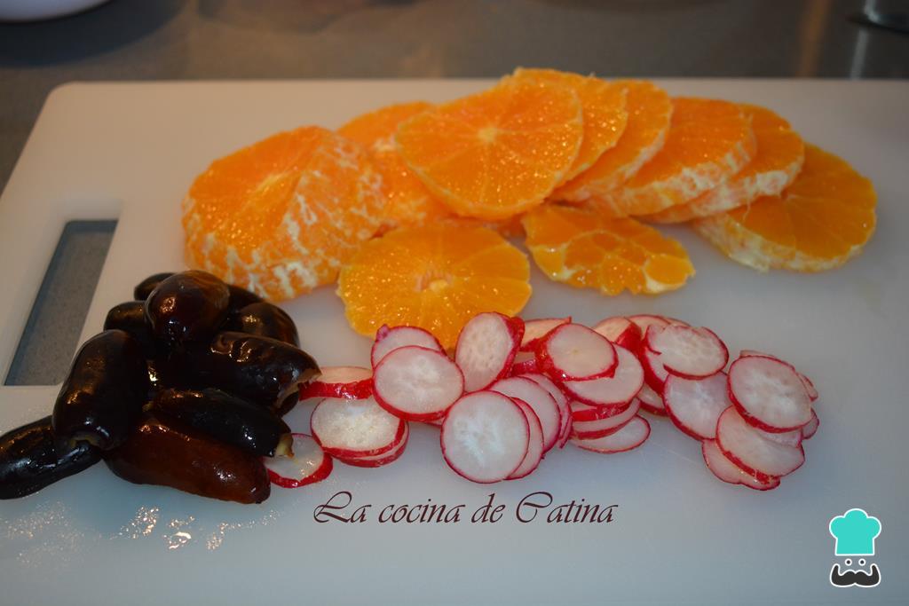 Descasque as laranjas, retirando a parte branca e de seguida corte-as em rodelas. Prepare também os rabanetes cortando-os em rodelas e as tâmaras retirando o caroço e cortando ao meio.