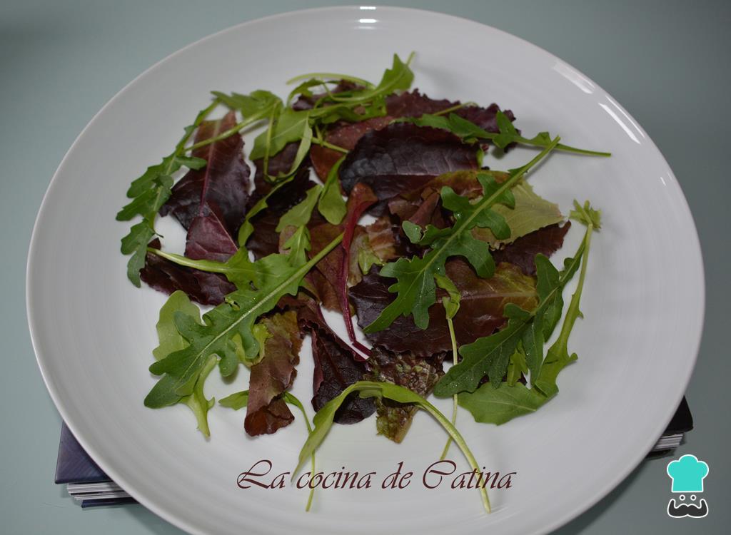 Em uma saladeira coloque a alface, a rúcula e por cima os restantes ingredientes.