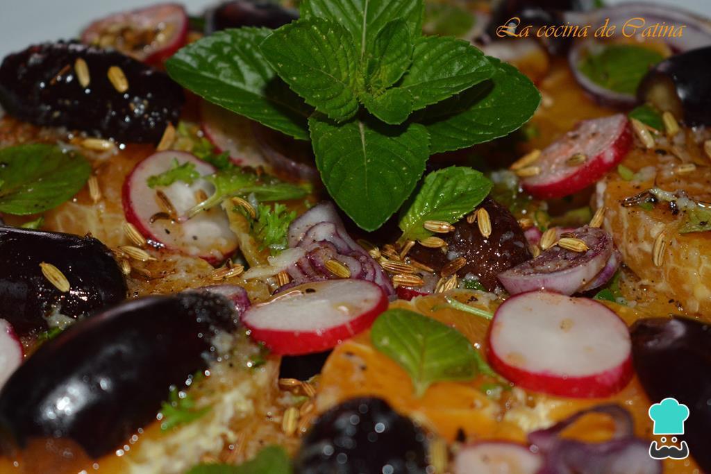 Tempere a salada com o molho de alho e está pronta a sua salada de tâmaras e laranja!