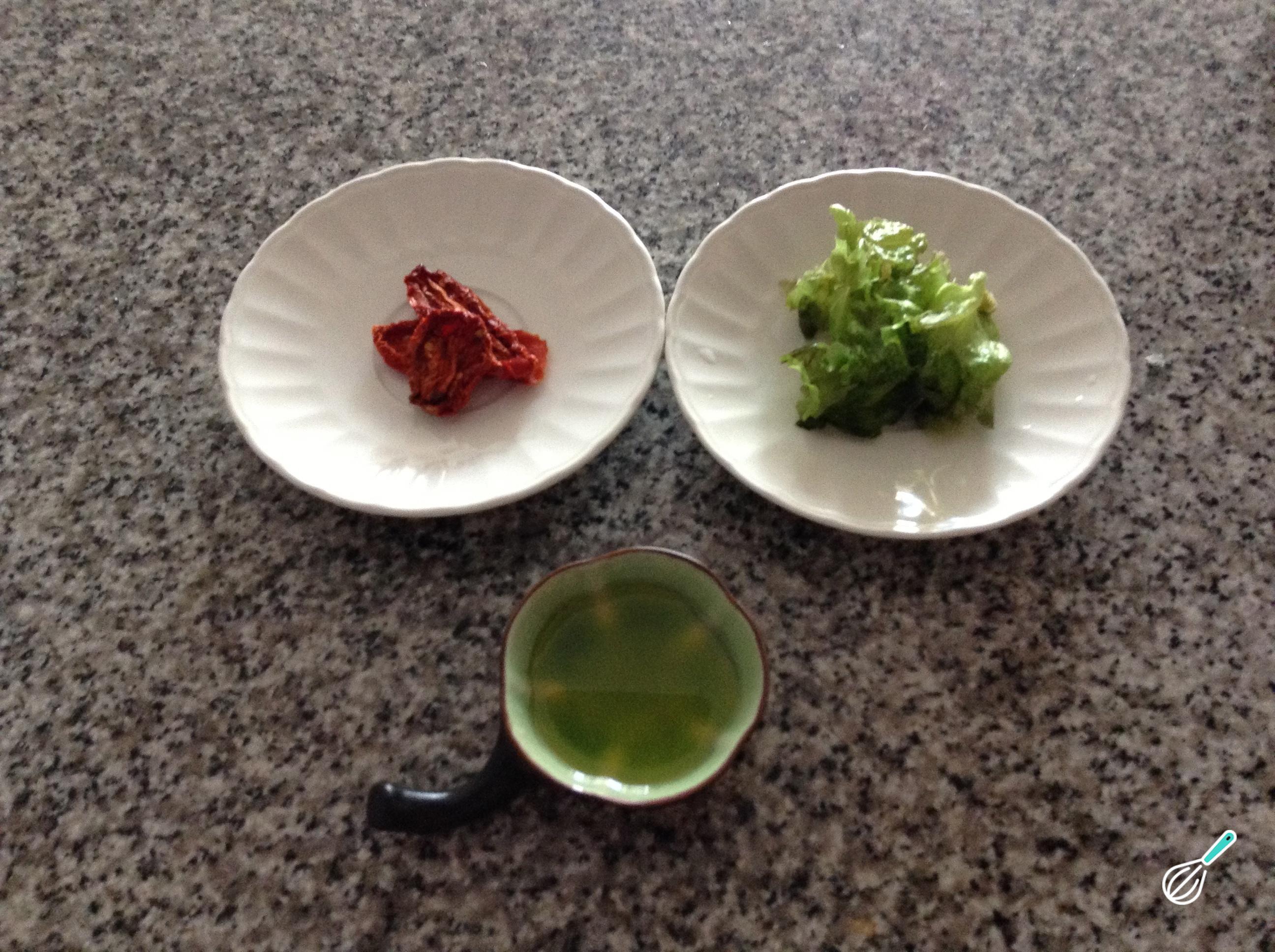 Comece por preparar os ingredientes desta salada de tomate seco - confira como fazer tomate seco caseiro e como fazer tomate seco no microondas.