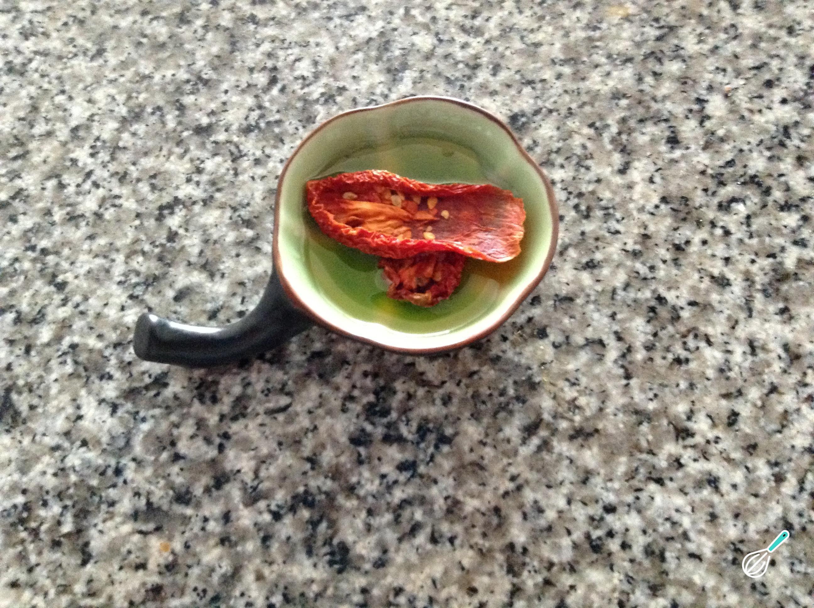 Em uma taça funda, hidrate os tomates secos com o azeite. O ideal é deixá-los aproximadamente 1 hora, para que hidratem bem.
