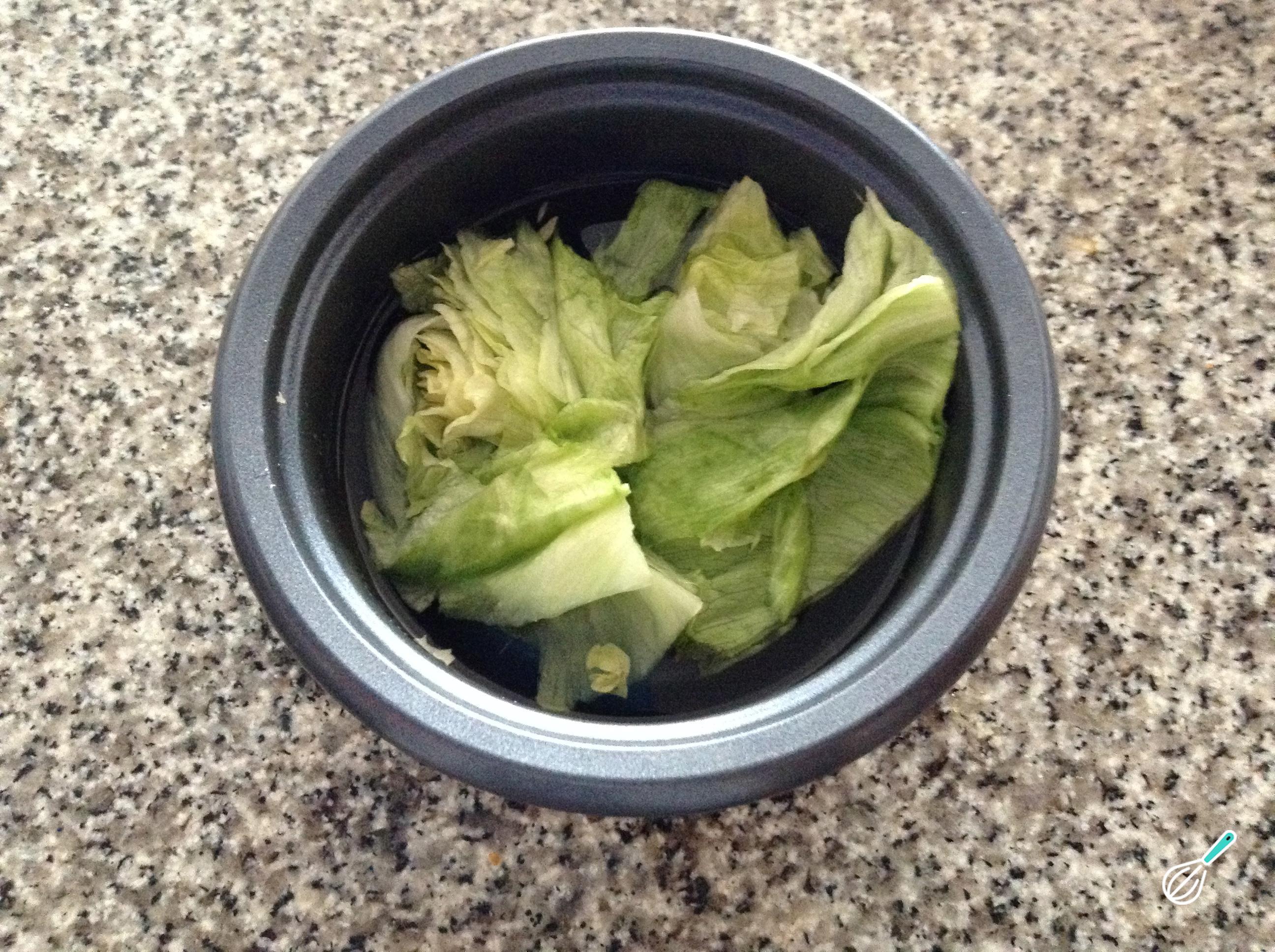 Continue preparando esta receita de salada de tomate seco: desfaça com as mãos as folhas da alface e coloque-as numa outra tigela. Adicione água e vinagre branco, para desinfetar, e deixe repousar por 15 minutos.