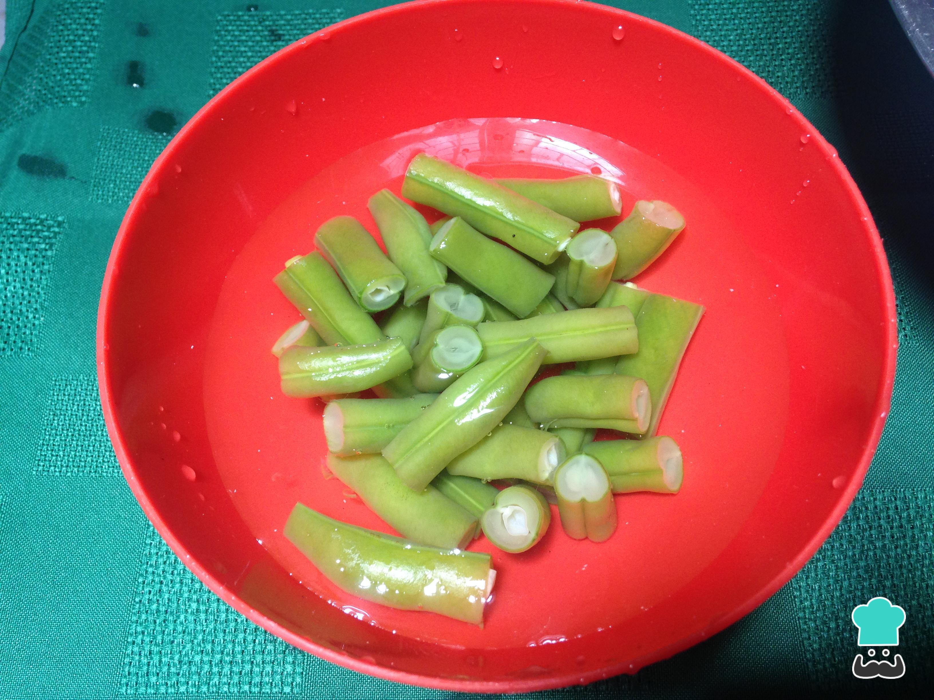 Continue preparando esta salada de vagem e batatas: retire o feijão após os 10 minutos de cozimento e coloque em água fria.