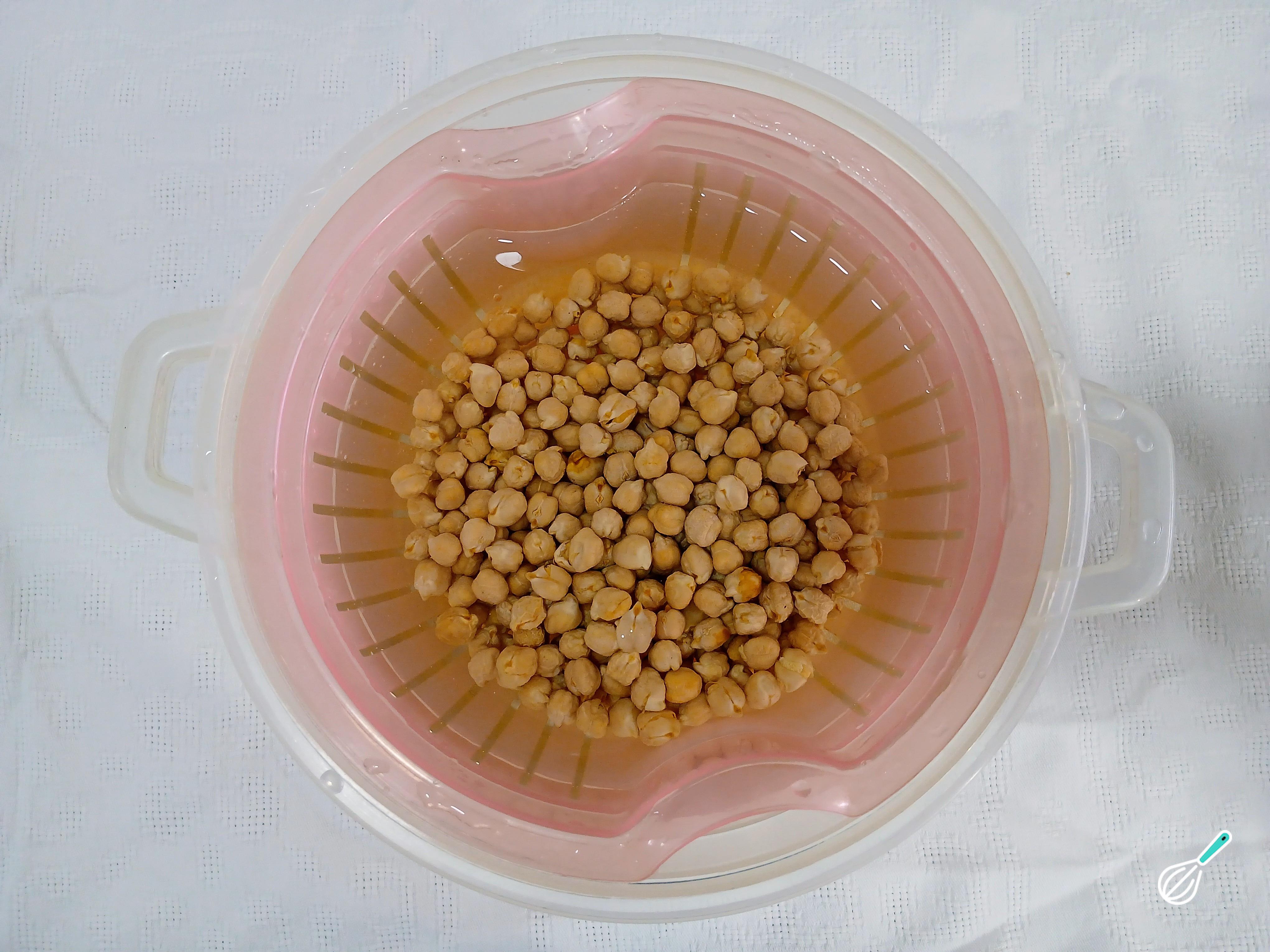 Comece lavando e colocando o grão-de-bico de molho por no mínimo 4 horas. É importante esse processo de molho, pois além de deixar o grão-de-bico mais macio, auxilia na digestão e ajuda a cozinhar mais rápido.