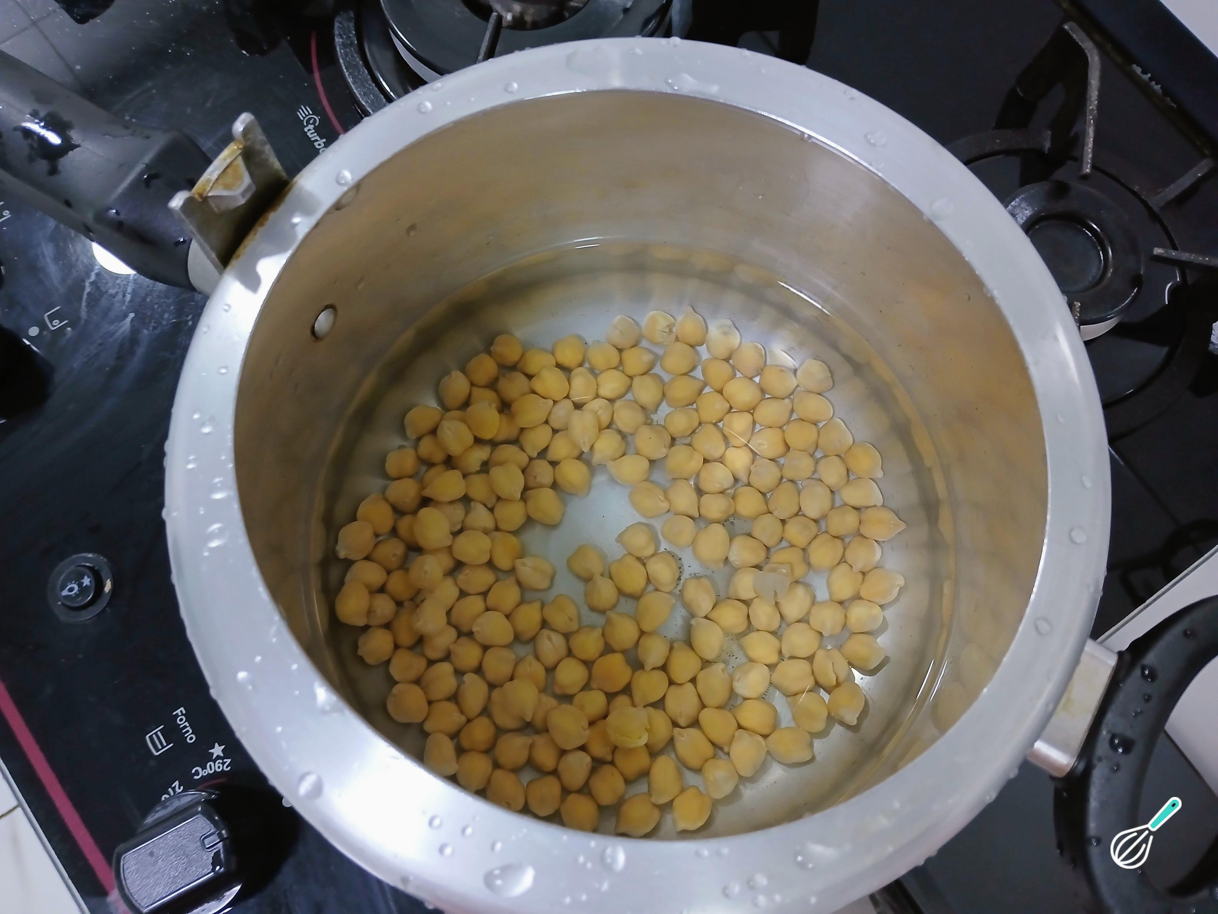 Depois de retirar o grão-de-bico do molho, coloque-o na panela de pressão e cubra com água. Acenda o fogo em temperatura média e tampe a panela.