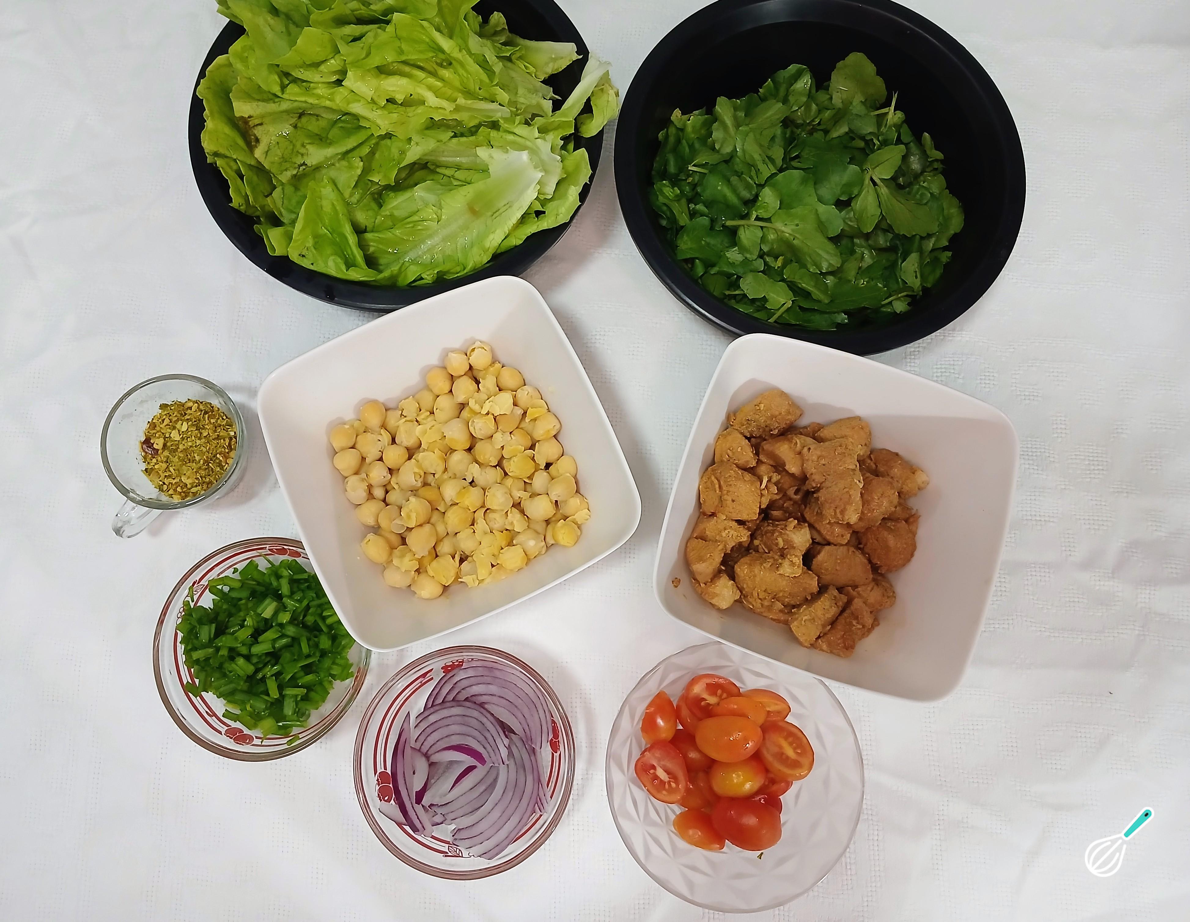 Depois de cozinhar o grão-de-bico, separe os demais ingredientes da salada. O alface, o agrião e os temperos para temperar e dar sabor a salada. Separe a cebola roxa cortada em meia lua, a cebolinha verde e a salsinha. Separe também o frango já cozido e cortado em cubinhos, os tomates cerejas, o azeite e o vinagre de maçã.