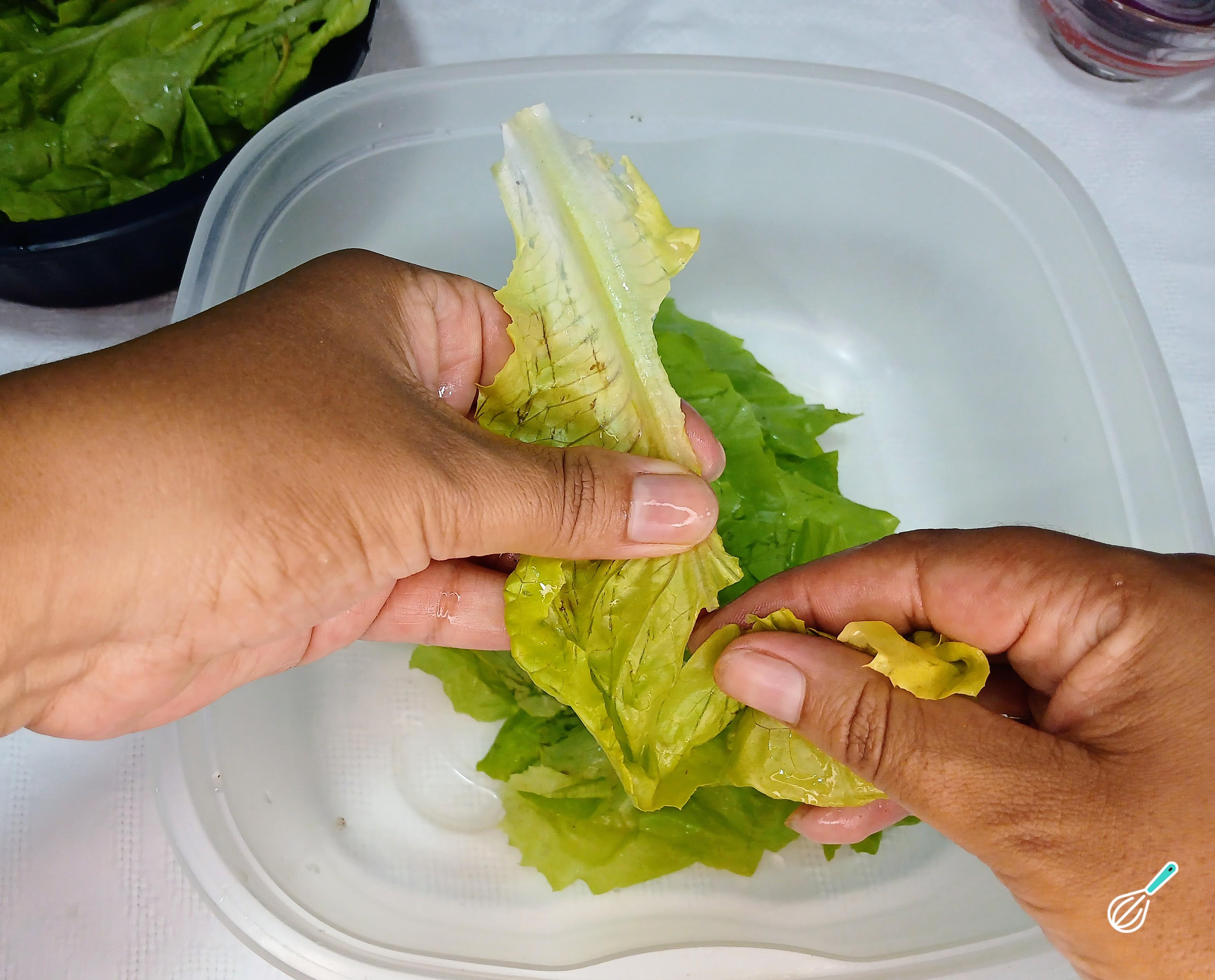 Com os ingredientes separados, lave bem a alface e retire o talo das folhas. Lave as folhas separadamente uma a uma.