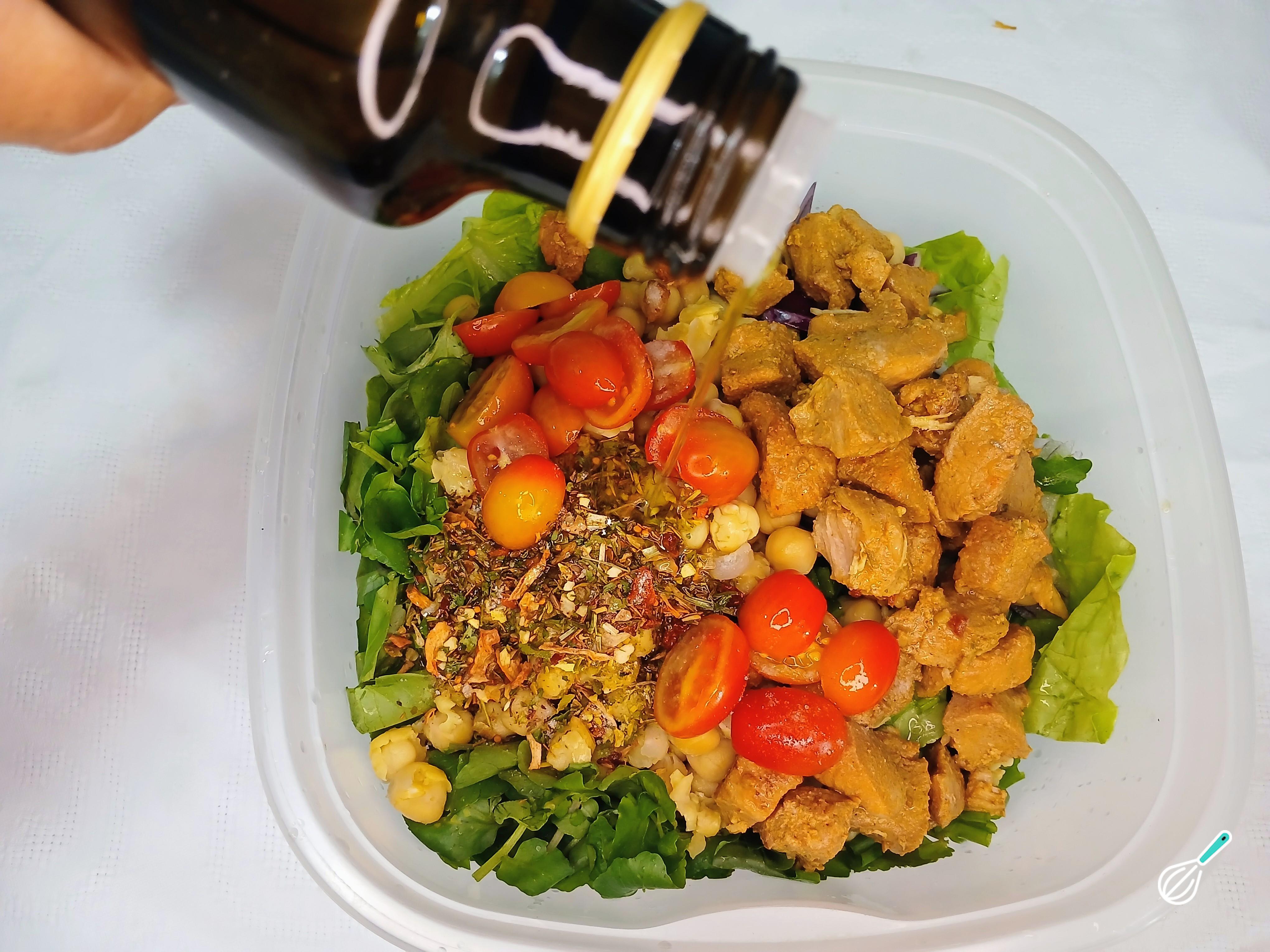 Adicione os tomates cerejas cortadas ao meio, o frango cortado em cubos, o grão-de-bico, os temperos a gosto, azeite e vinagre de maçã. Adicione sal e misture tudo muito bem.