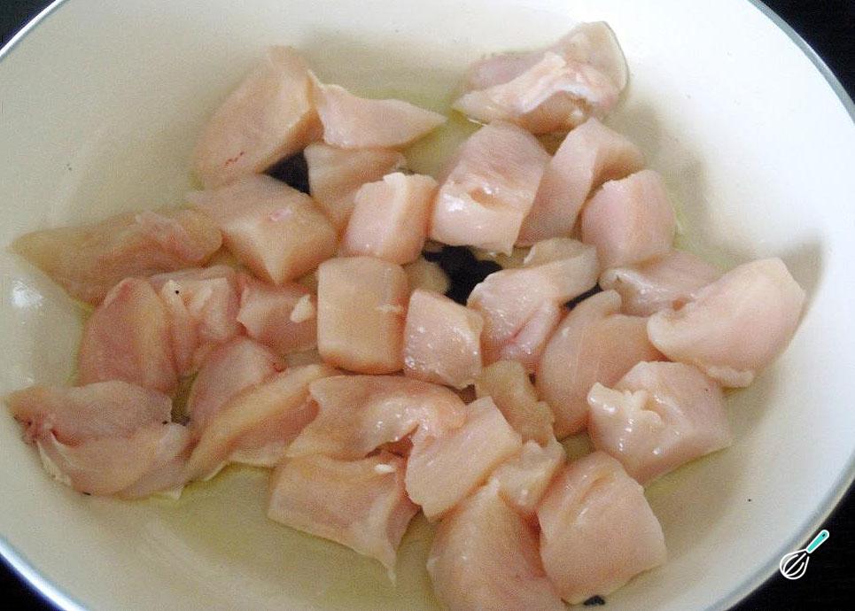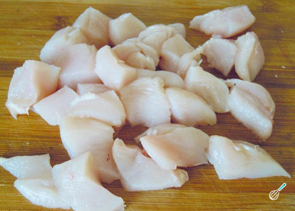 Para preparar esta salada de frango especial comece por cortar o peito de frango em pedacinhos. Iremos servir o frango sem desfiar, por isso é importante que os pedacinhos não sejam muito grandes, assim poderão ser consumidos em uma só mordida.