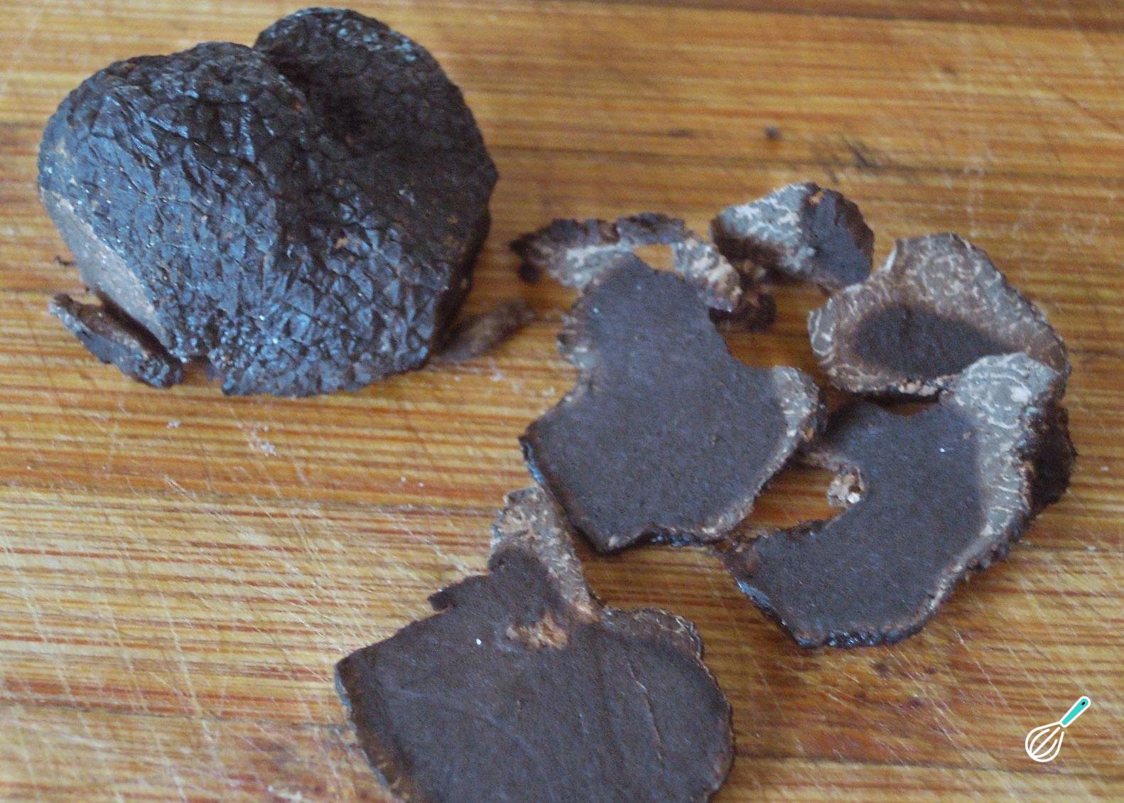 Em seguida fatie a trufa em lascas ou rale no ralo grosso. A trufa negra é um tipo de cogumelo raro que se desenvolve no subsolo e, por isso, apresenta sabor intenso (semelhante a funghi, com notas de avelã). Também é conhecida como trufa de inverno.
