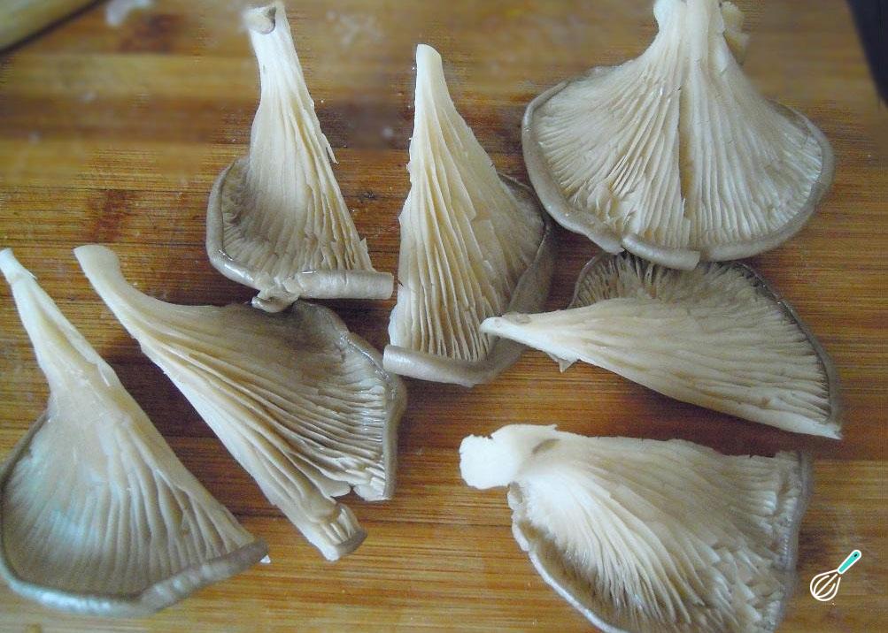 Enquanto isso limpe os cogumelos pleurotus e corte em pedaços menores. Lave os tomates e corte-os ao meio. Quando o frango estiver pronto, retire-o para um prato e adicione mais um pouco de azeite na frigideira.