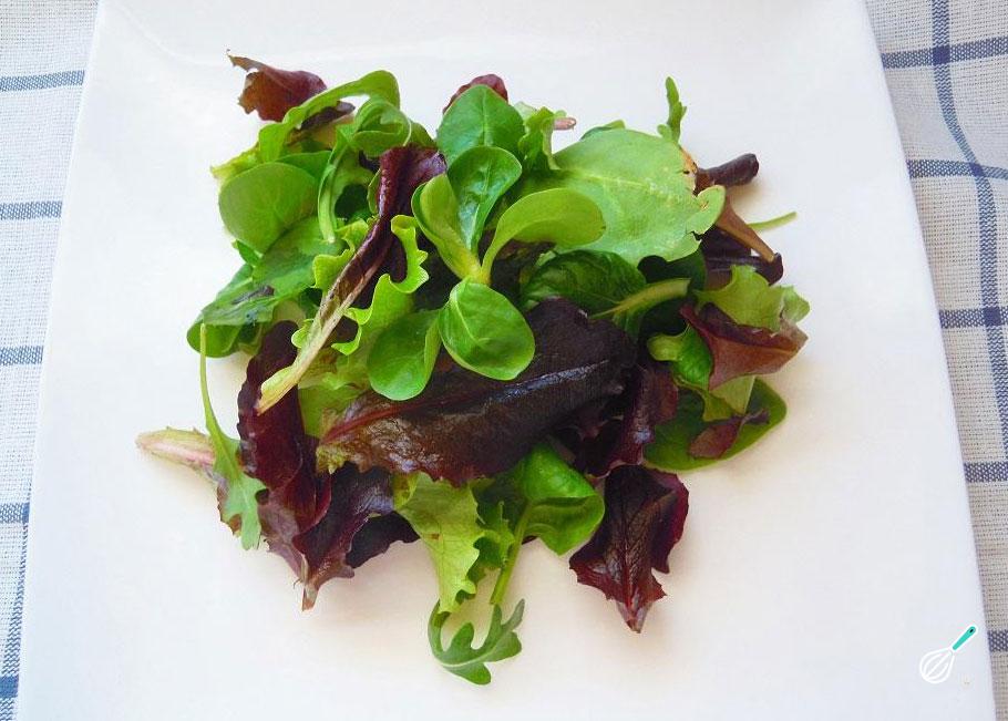 Por fim, coloque o mix de folhas no prato em que vai servir esta salada gourmet com frango - se necessário, higienize as folhas antes de colocar no prato.