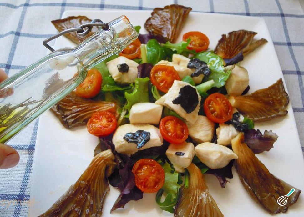 Disponha os demais ingredientes por cima das folhas verdes e em redor: os pedaços de frango com as trufas, os cogumelos e os tomates. Regue com um pouco de azeite de alecrim e está pronta sua salada de frango com cogumelos!