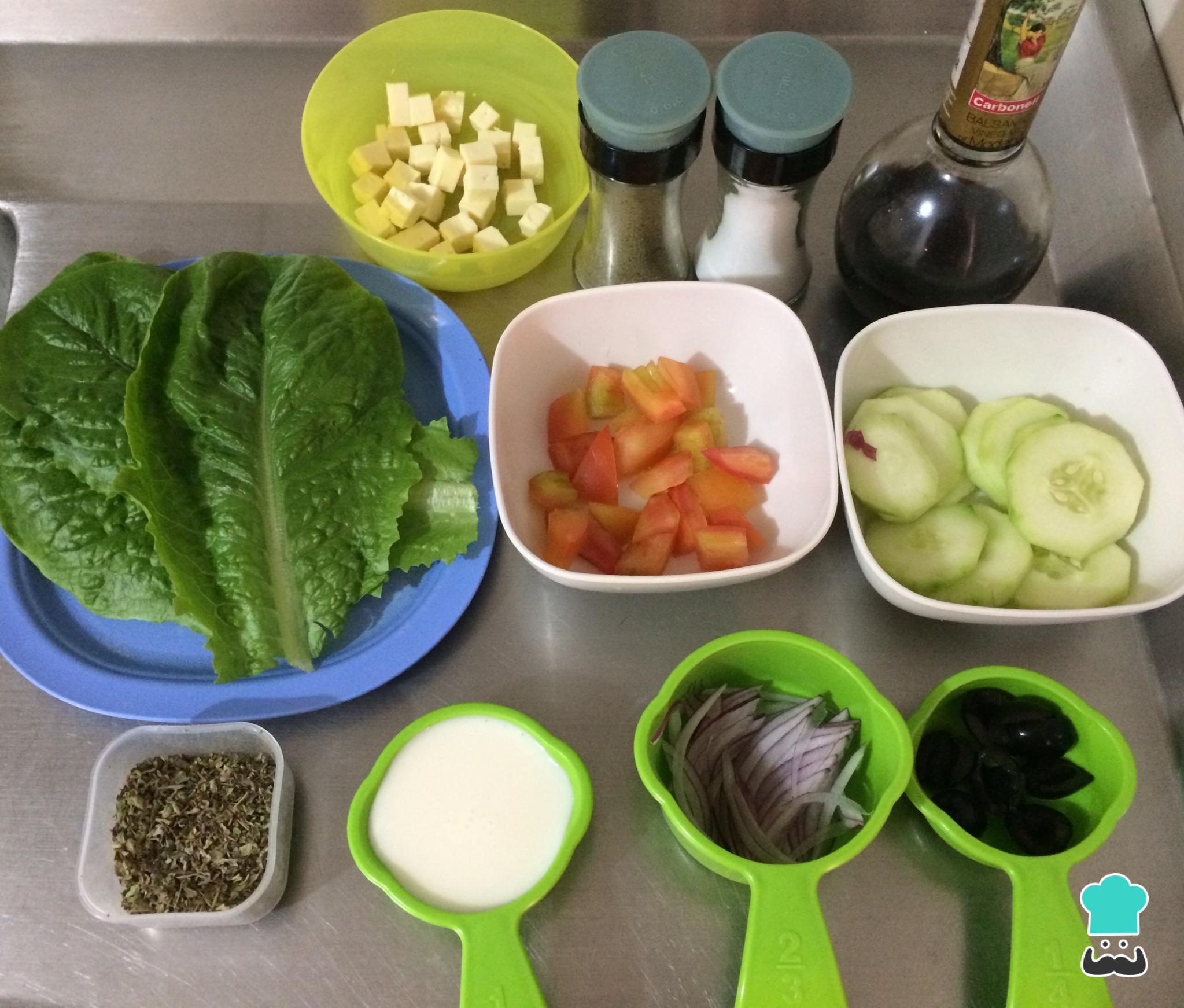 Para preparar esta saborosa salada grega com iogurte comece por reunir todos os ingredientes.