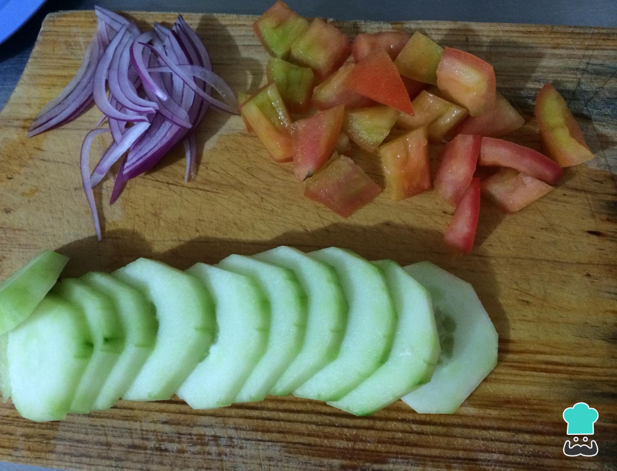 Corte a cebola em juliana, pique o tomate, descasque e corte o pepino em rodelas.