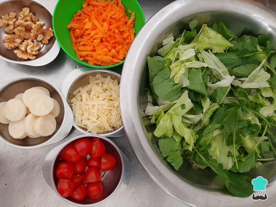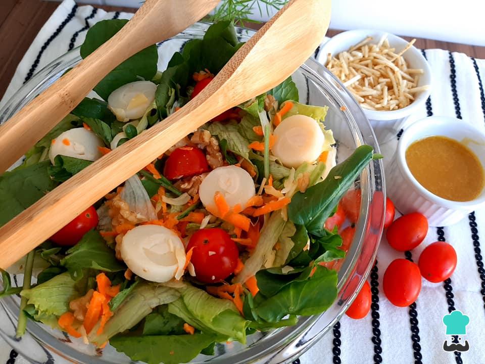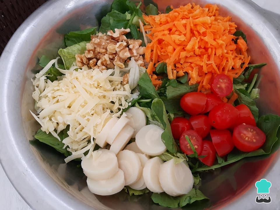 Essa salada tem em sua composição verduras, cenoura, tomatinhos, palmito, queijo parmesão, batata palha, nozes picadas (que pode ser opcional, mas já adianto que deixa um sabor inigualável à salada) regados com um molhinho feito a base de azeite de oliva, mostarda e mel! É ou não é uma receita de salada irresistível?