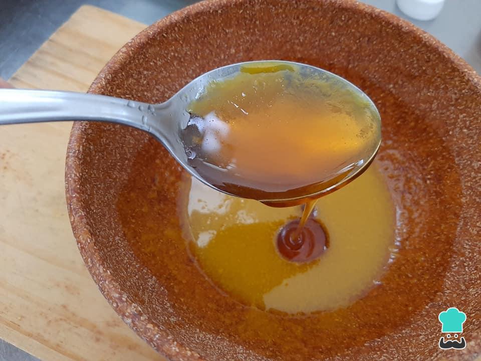 Prepare o molho agridoce para salada, juntando o azeite de oliva, o limão, a mostarda, o sal e o mel. Misture tudo com um garfo até o molho ficar espesso.