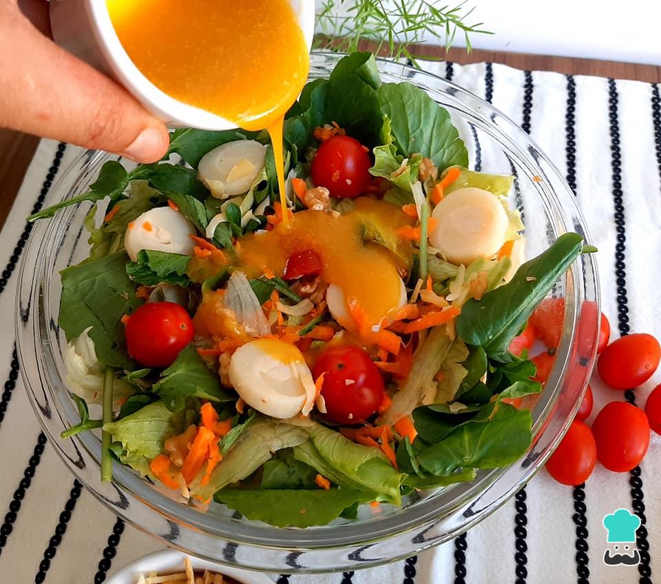 Acomode a salada numa travessa ou um bowl e regue com o molho na hora de servir.