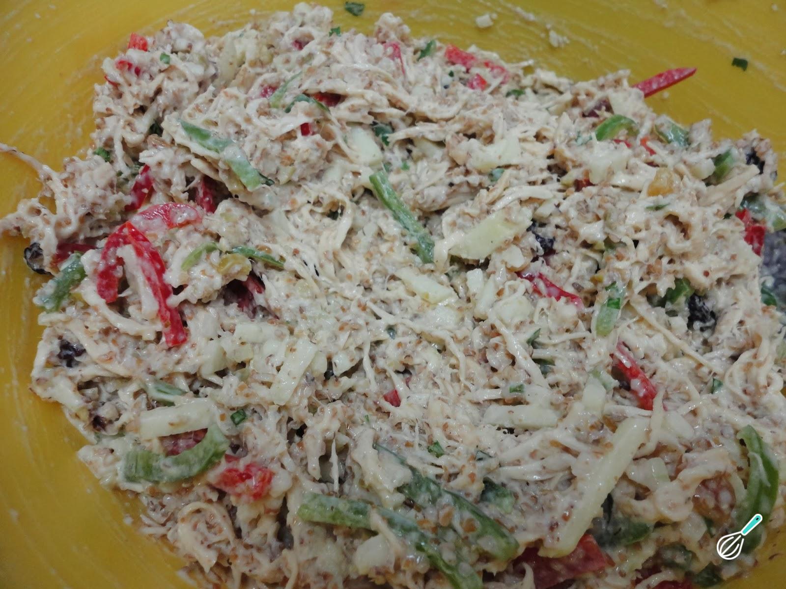 De seguida pique a cebola, o pimentão e as maçãs em pedaços pequenos. Coloque numa tigela e acrescente o trigo, o frango, a uva-passa e as azeitonas. Tempere com suco de limão, mostarda, maionese, pimenta e sal a gosto e misture tudo muito bem. Reserve na geladeira por 1-2 horas.