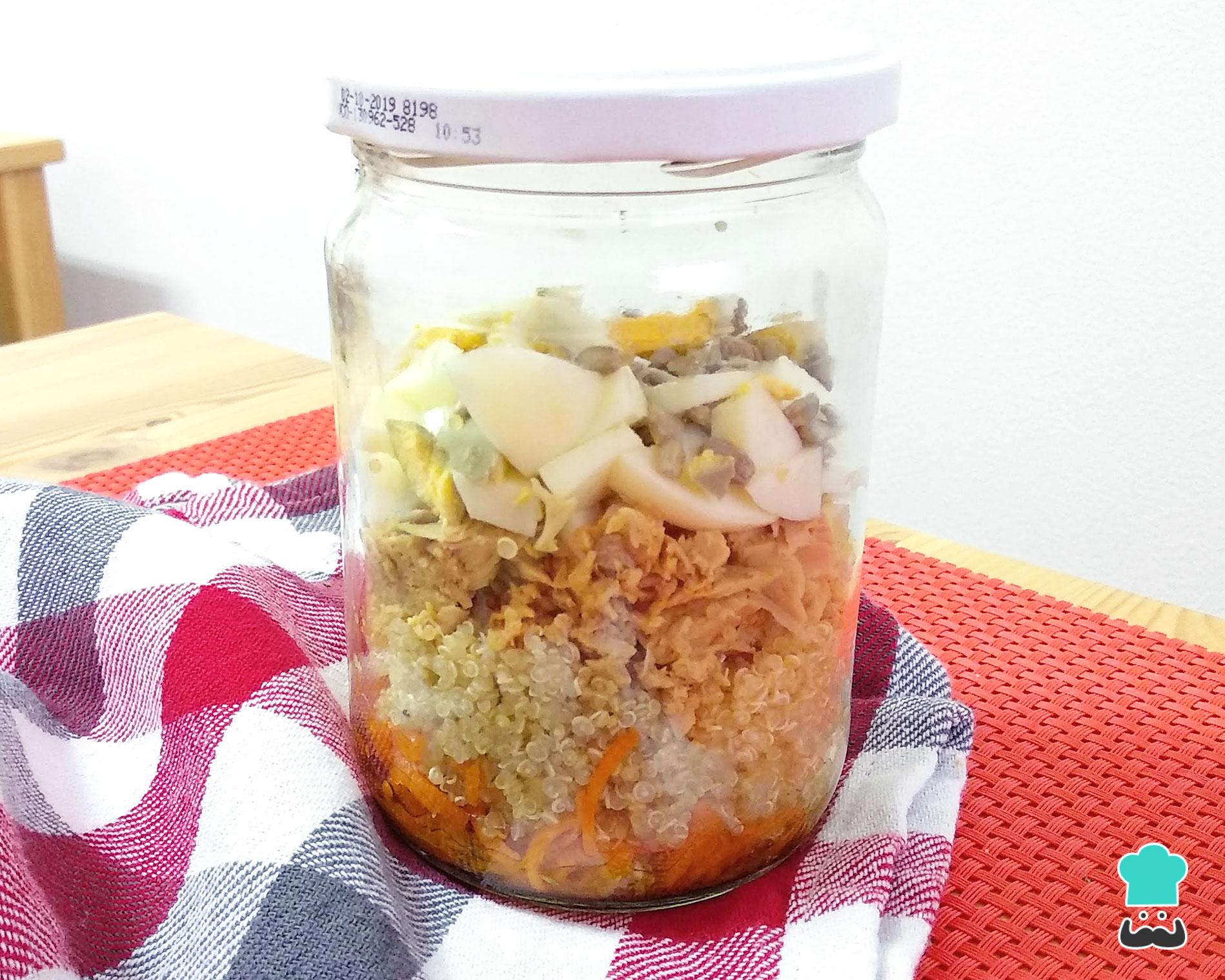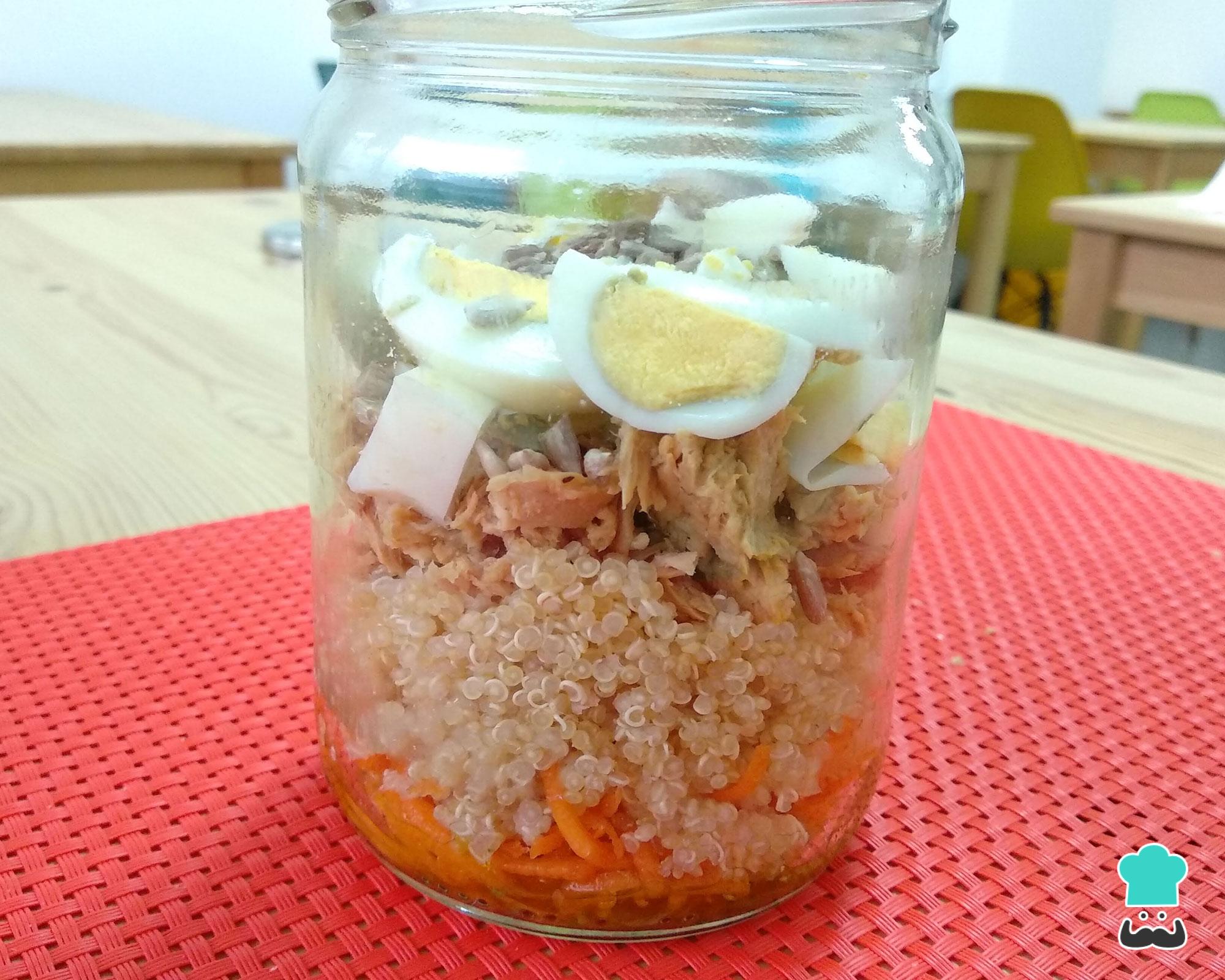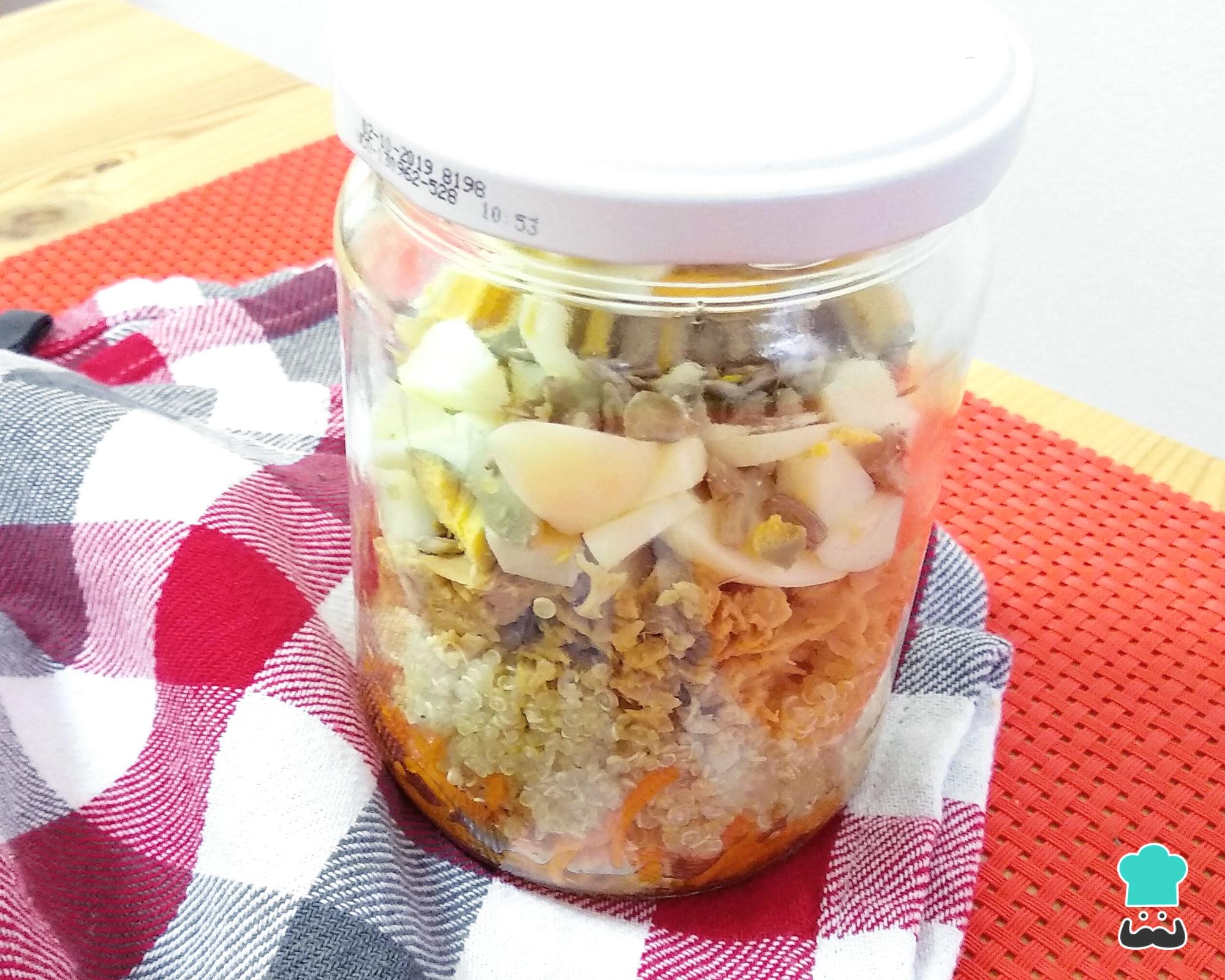 Esta receita de salada no pote low carb é preparada com atum, quinoa, cenoura, ovo cozido e sementes de gergelim: tudo ingredientes baixos em gordura, nutritivos e válidos para uma alimentação low carb e saudável. O molho também é bem simples, é um molho vinagrete do tipo francês, preparado com azeite de oliva, suco de limão e oréganos.