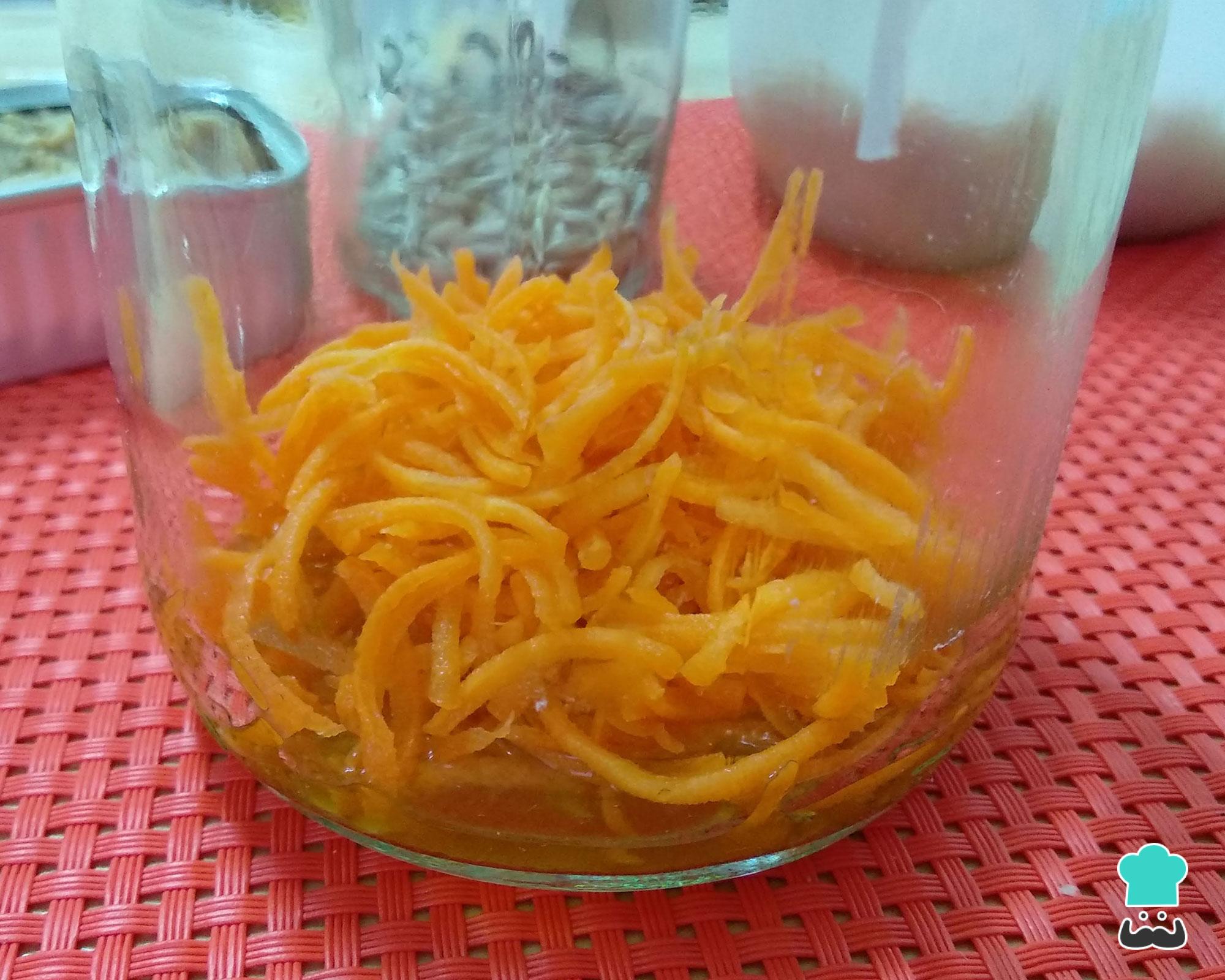 Num recipiente misture os ingredientes do molho da salada no pote: o azeite de oliva, o suco de limão, os oréganos e o sal. Coloque esse molho no fundo do pote e cubra com a cenoura ralada.